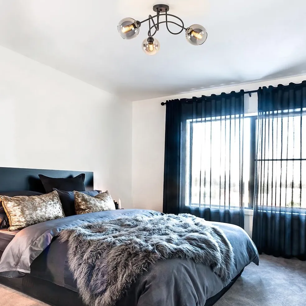 Sierlijke trendy 3-lichts plafondlamp. Deze mat zwarte plafondlamp is een leuke combinatie tussen stoer en sierlijk. Het fraaie armatuur loopt krullend in elkaar over. De smoke glazen bollen geven de lamp dat stoere en ook luxe randje. De lamp is leuk voor in een slaapkamer of een hal. De lamp wordt exclusief lichtbronnen geleverd en is dimbaar middels een externe dimmer (exclusief).