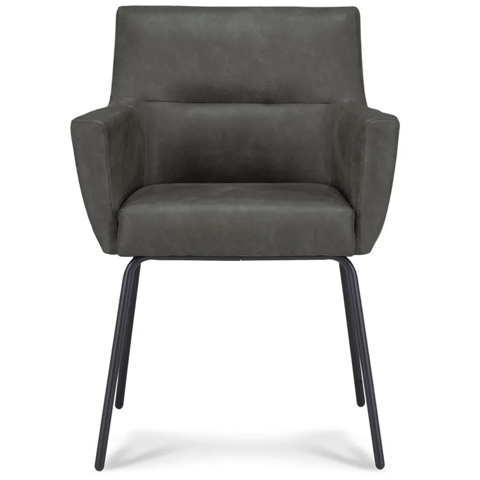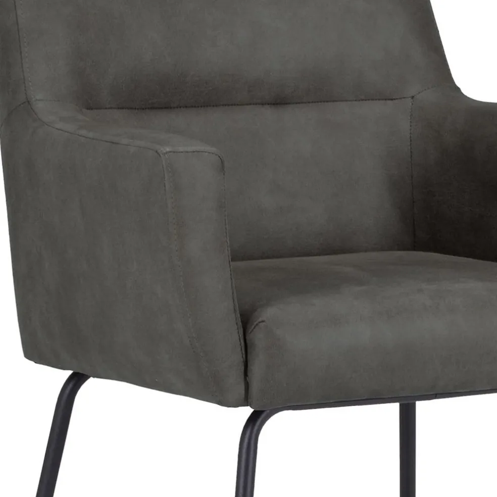 Deze armstoel heeft een fijne zitting met een hoog zitcomfort. De zitting is volledig gemaakt van bull leder en voelt enorm zacht aan. Bull leder, ook wel eco leer genoemd, is een combinatie van gerecycled buffelleer en polyester stof waardoor er een stevige kwaliteit ontstaat maar wel enorm zacht aanvoelt. Dit maakt het borrelen of genieten van een bak koffie wel heel erg fijn op deze eetkamerstoel. De poot is gemaakt van metaal en afgewerkt met een mat zwarte finish.
