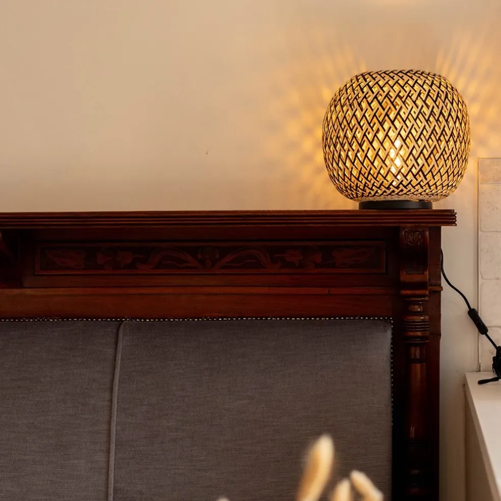 Maak het interieur helemaal af met deze sfeervolle tafellamp. De tafellamp heeft een ronde kap die volledig is gemaakt van bamboe. Doordat er gebruik is gemaakt van naturel en zwart ontstaat er een mooi effect in het vlechtwerk. De ronde bamboe kap wordt ondersteund door een metalen mat zwarte voet die is voorzien van een E27 fitting en een zwart snoer met een lengte van 180 cm. De schakelaar bevindt zich op 40 cm van de voet. De sfeervolle bamboe tafellamp is een leuke toevoeging voor op een dressoir, bijzettafel of het nachtkastje.