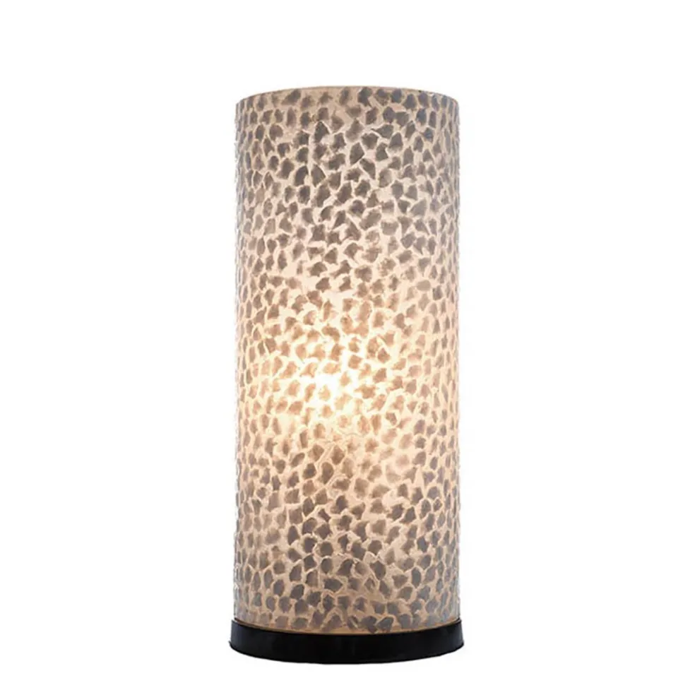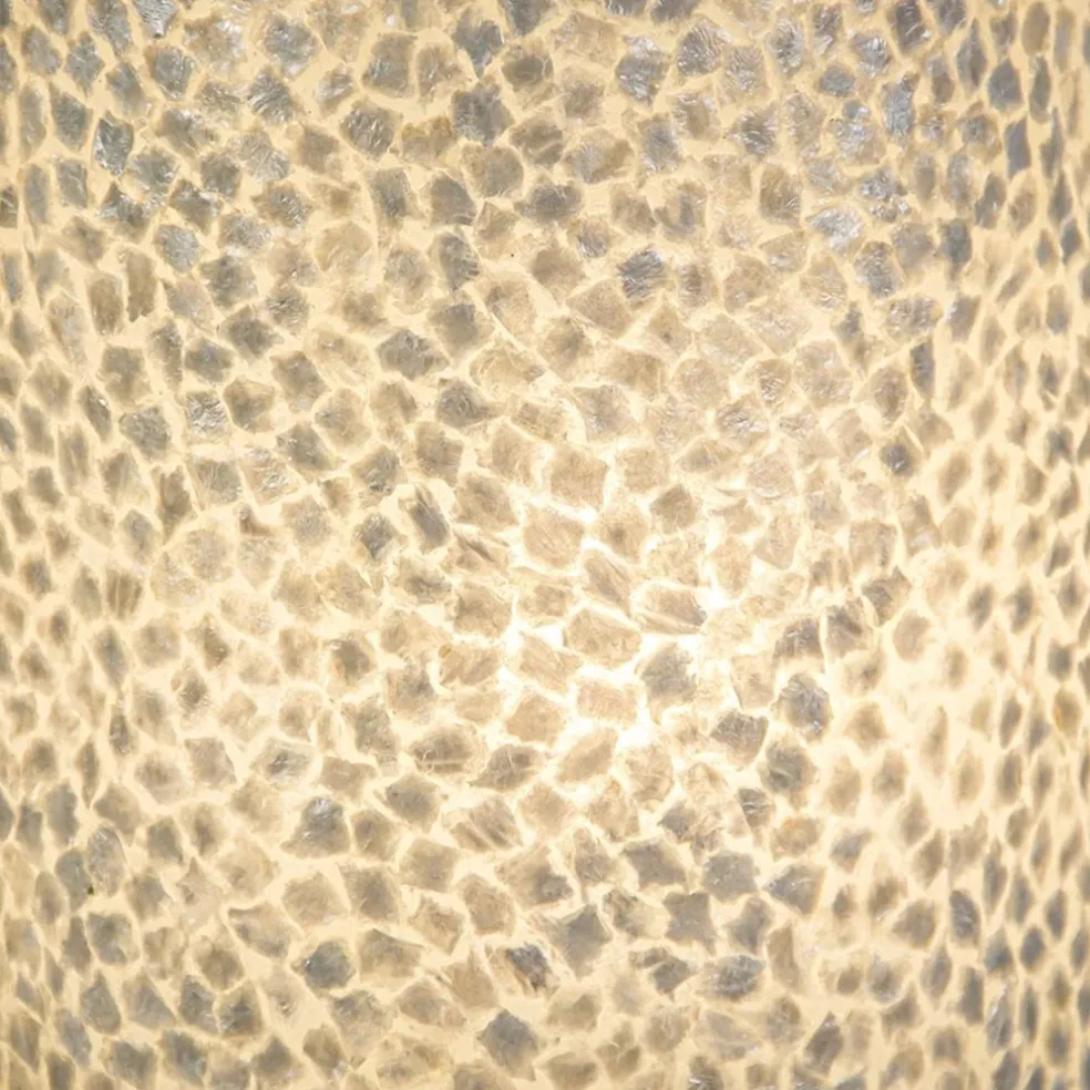 Een sfeervolle toevoeging voor een botanisch, beach of bohemian interieur. Deze cilinder tafellamp heeft een afmeting van 40×17 cm en is gemaakt van fiberglas waar witte capiz schelpen op zijn bevestigd. De schelpen zorgen voor een leuk effect wanneer de lamp wordt ingeschakeld en geeft zo een sfeervolle verlichting. De cilinder schelpenlamp heeft een zwarte voet en is voorzien van een zwart snoer met een schakelaar.