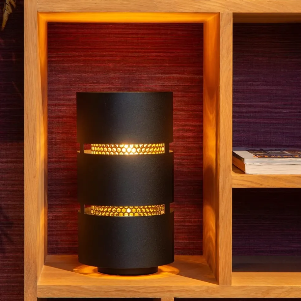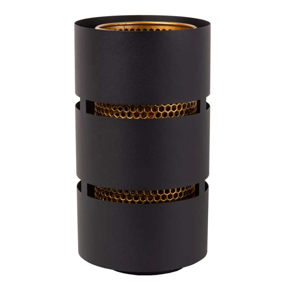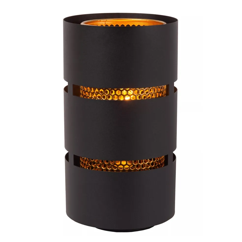 Een stoere tafellamp die z’n inspiratie vind in de natuur. De binnenste kap is namelijk geïnspireerd op de binnenzijde van een bijenkorf. Dit is dan ook uitgevoerd in het goud zodat de lamp een warme gloed afgeeft aan het interieur. De cilinder tafellamp is volledig gemaakt van metaal en heeft een mat zwarte buitenkap. De combinatie van het zwart en goud maakt de lamp prima geschikt voor diverse woonstijlen. De tafellamp is een sfeervolle toevoeging op een kast, dressoir of zelfs het nachtkastje en is voorzien van een zwart snoer met een lengte van 180 cm.