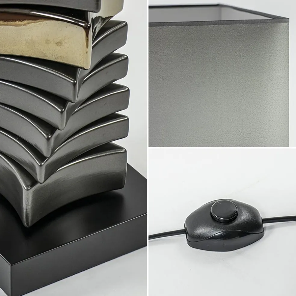 Deze prachtige vloerlamp is een ware eyecatcher in het interieur. De staande lamp heeft een keramieken voet die is opgebouwd uit losse delen. Doordat deze verspringen ontstaat er een speels design wat, mede door het goud dat erin verwerkt is, een luxe uitstraling heeft. De voet is gecombineerd met een grote vierkante kap in het grijs. De lamp is een verrijking voor uw woonstijl en staat prachtig naast de bank of in een donkere hoek. De staande schemerlamp is voorzien van een zwart snoer van 135 cm met een schakelaar op 15 cm en wordt exclusief lichtbron geleverd.