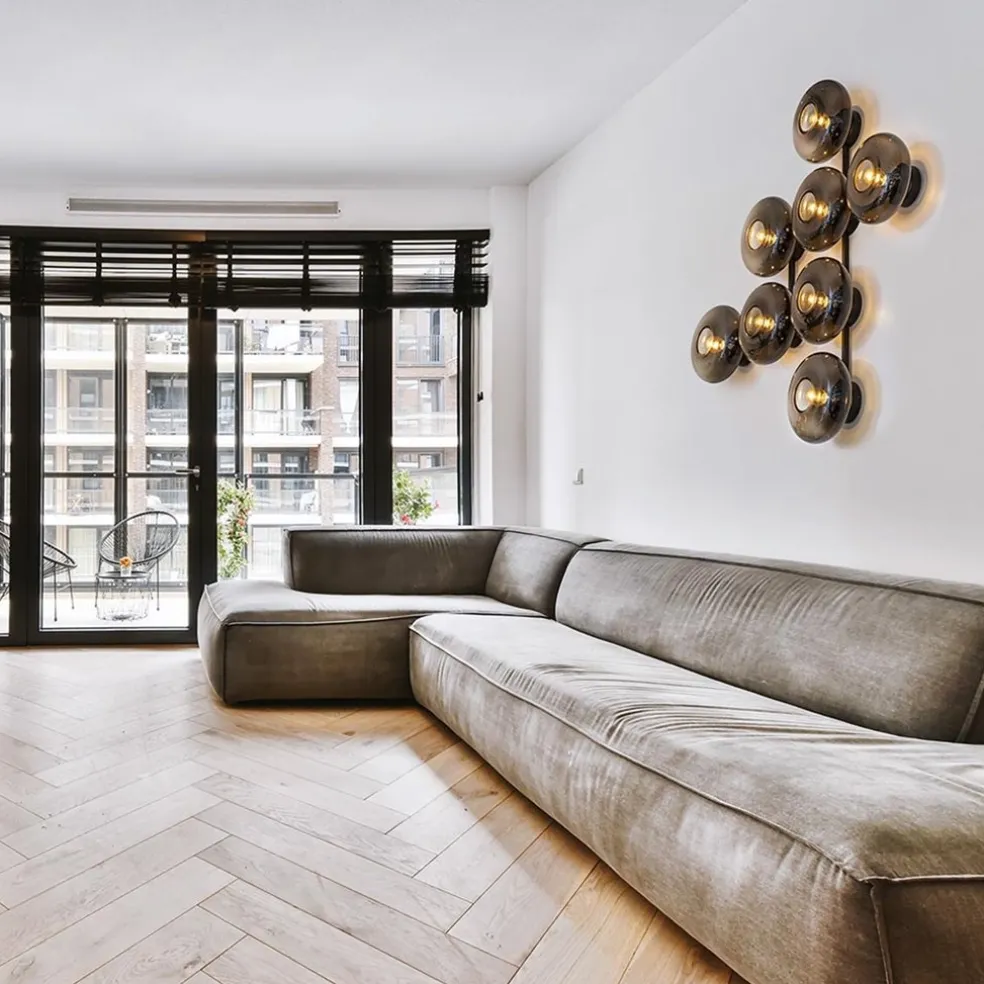 Een prachtig design met een speelse look. Deze grote wandlamp is een echte eyecatcher in het interieur. De wandlamp bestaat uit een mat zwart metalen frame waar 8 lichtpunten op zijn verwerkt. Deze zijn ieder voorzien van een smoke glazen kap. Het donkere glas geeft de wandlamp een luxe uitstraling die wordt versterkt door de vorm van het glas. U kunt de lamp zelf naar wens ophangen. Deze wordt met 2 bevestigingen vastgezet op de muur. Hang de lamp recht van een strakke look, of juist schuin om het speels te maken. De wandlamp is in ieder geval een verrijking voor het interieur.