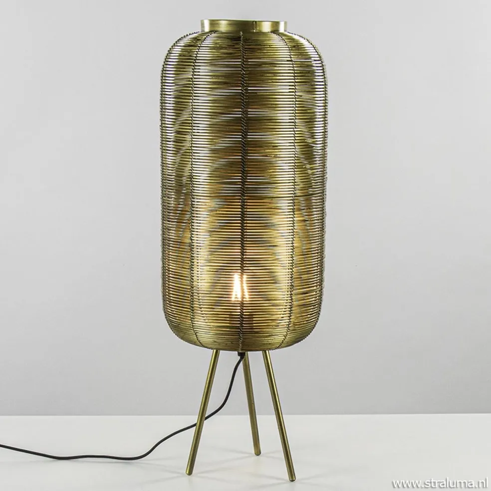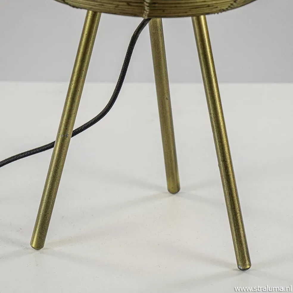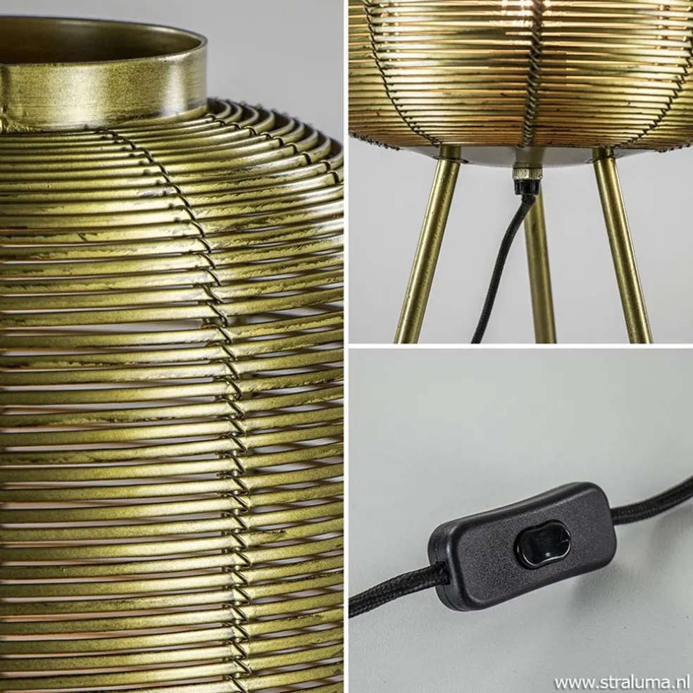 Een leuke sfeervolle draad tafellamp op een driepoot. Tomek is voorzien van een antiek bronzen draad kap waar het licht zachtjes doorheen schijnt. Voordeel hiervan is dat u niet direct in de lichtbron kunt kijken. De kap is volledig van metaal en alleen aan de bovenzijde open zodat de lichtbron gemakkelijk kan worden geplaatst. De kap wordt ondersteund door drie metalen pootjes, eveneens in het antiek brons. De sfeervolle tafellamp wordt geleverd met een zwart strijkijzersnoer van 185 cm met een schakelaar op 90 cm van de lamp en exclusief lichtbron (E27).