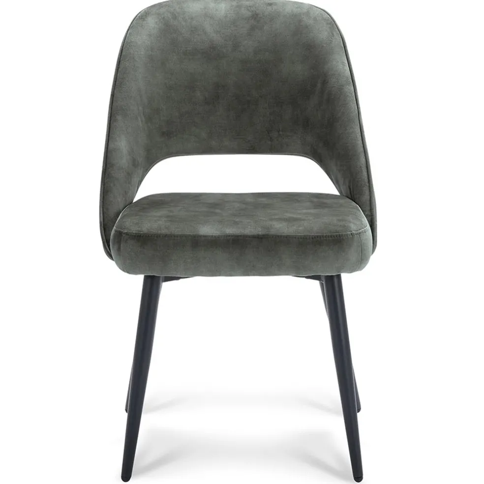 Chique, trendy en comfortabel. Deze fijne stoel zorgt met het wat dikkere zitkussen voor een fijne zit die wordt versterkt door de rugleuning. Deze is van onder open voor een mooi open effect. De zitting en de rugleuning zijn volledig van een velourse stof wat een chique luxe uitstraling geeft. Het stiksel op de rug geeft hier nog extra allure aan. De eetkamerstoel is verder afgewerkt met zwarte pootjes.