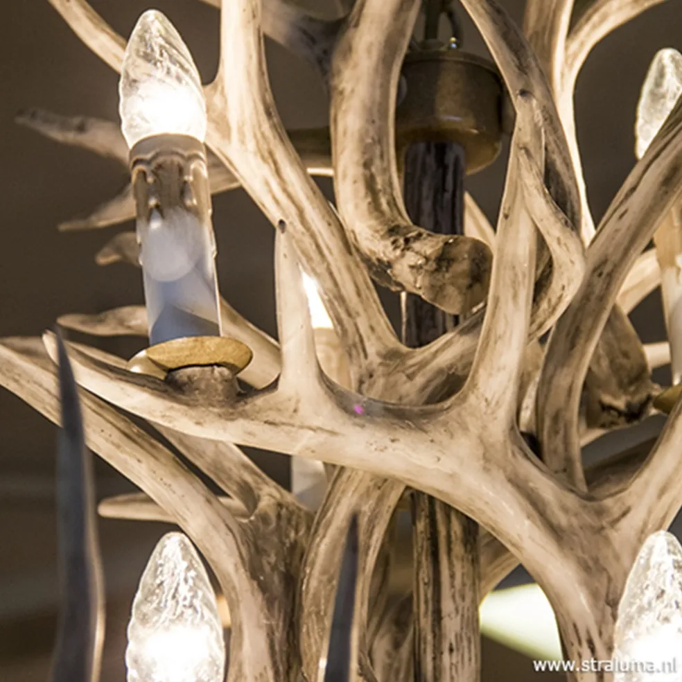 Deze grote ‘kroonluchter’ van geweien geeft het interieur een unieke twist. De nagemaakte geweien geven een landelijk gevoel terwijl de lichtbronnen in de vorm van een kaars een klassieke touch geven. De grote hanglamp doet het goed in een landelijk interieur en past mooi boven een grote tafel. Ook in een vide zou deze grote lamp niet misstaan. De kroon is voorzien van twaalf lichtbronnen en hangt aan een metalen ketting die is in te korten.
