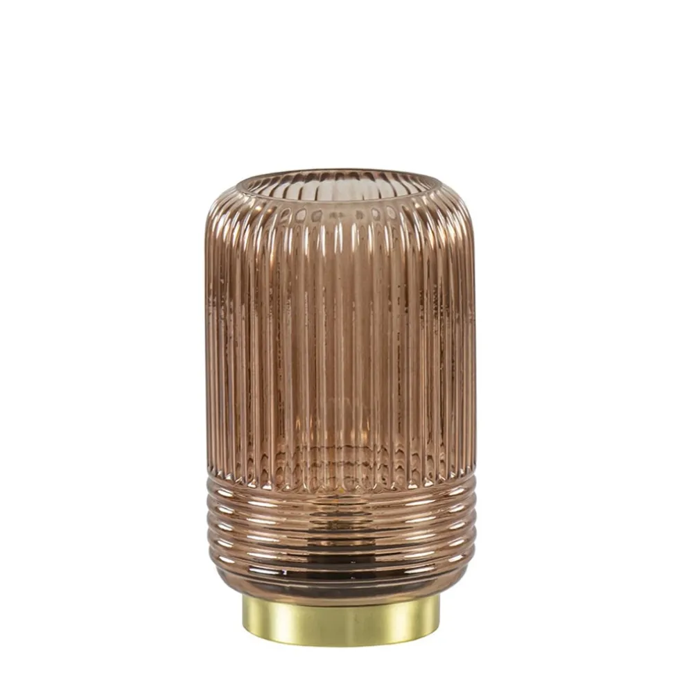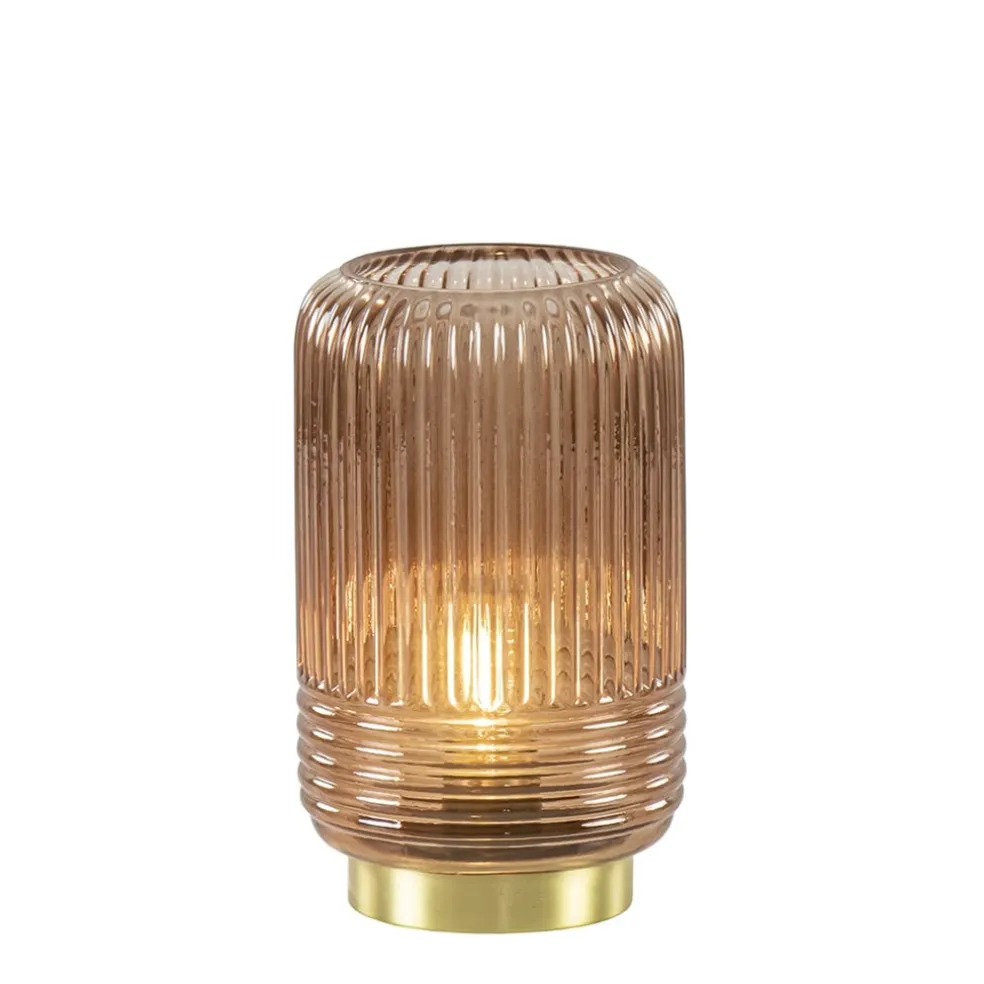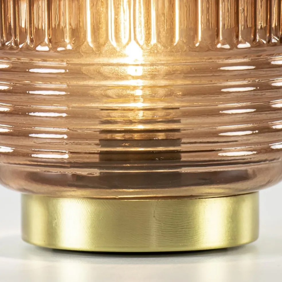 Het glas van deze tafellamp op baterijen heeft ribbels, het onderste deel horizontaal, daarboven zijn de ribbels verticaal. Het glas is bruin/amber en half-transparant. Het glas heeft een mooie glans. Door de ribbels krijgt deze tafellamp een mooi licht-effect. Niet alleen wanneer het lampje aanstaat, maar zeker ook wanneer het uit staat. Het tafellampje werkt op 2 AAA-batterijen. Leuk in een klassiek, landelijk of luxe interieur.