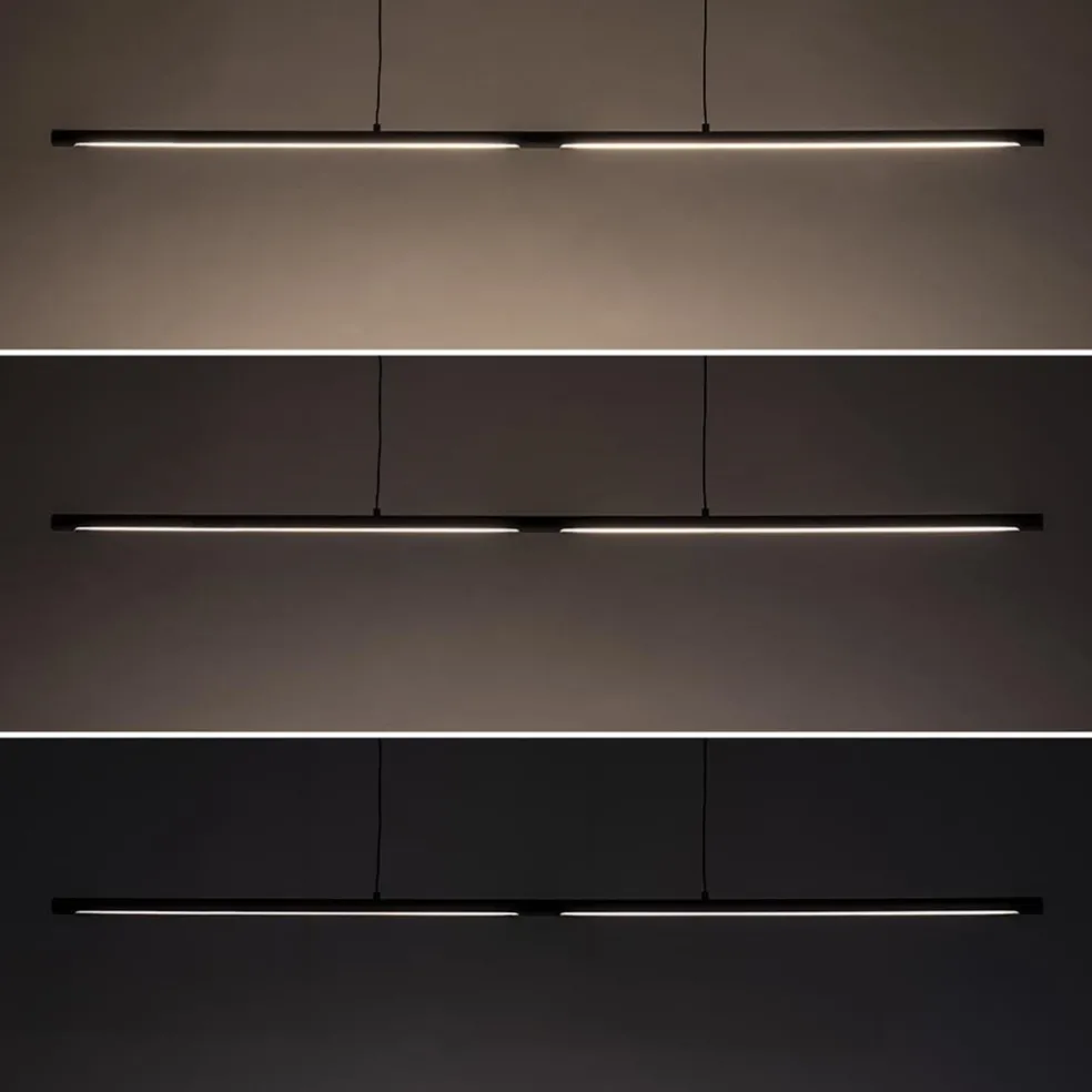 Een strak vormgegeven hanglamp met een fijne functie. De LED hanglamp is namelijk voorzien van een 3-standen dim functie. Dit houdt in dat u de hanglamp gemakkelijk kunt dimmen door middel van de gewone wandschakelaar. Zodra u de lamp inschakelt begint deze op zijn felste stand. Haalt u de schakelaar nog een keer over dan dimt deze een stap verder. Doet u dit nogmaals dan staat de lamp op zijn zachtste stand. Het ideale is dat u dus geen externe dimmer nodig heeft. De minimalistische kap hangt aan twee zwarte draden die naar wens zijn in te korten en wordt aan het plafond bevestigd met een balk van 45 cm. De moderne LED hanglamp is volledig in het zwart uitgevoerd en is mooi toe te passen in een eetkamer of kantoor.