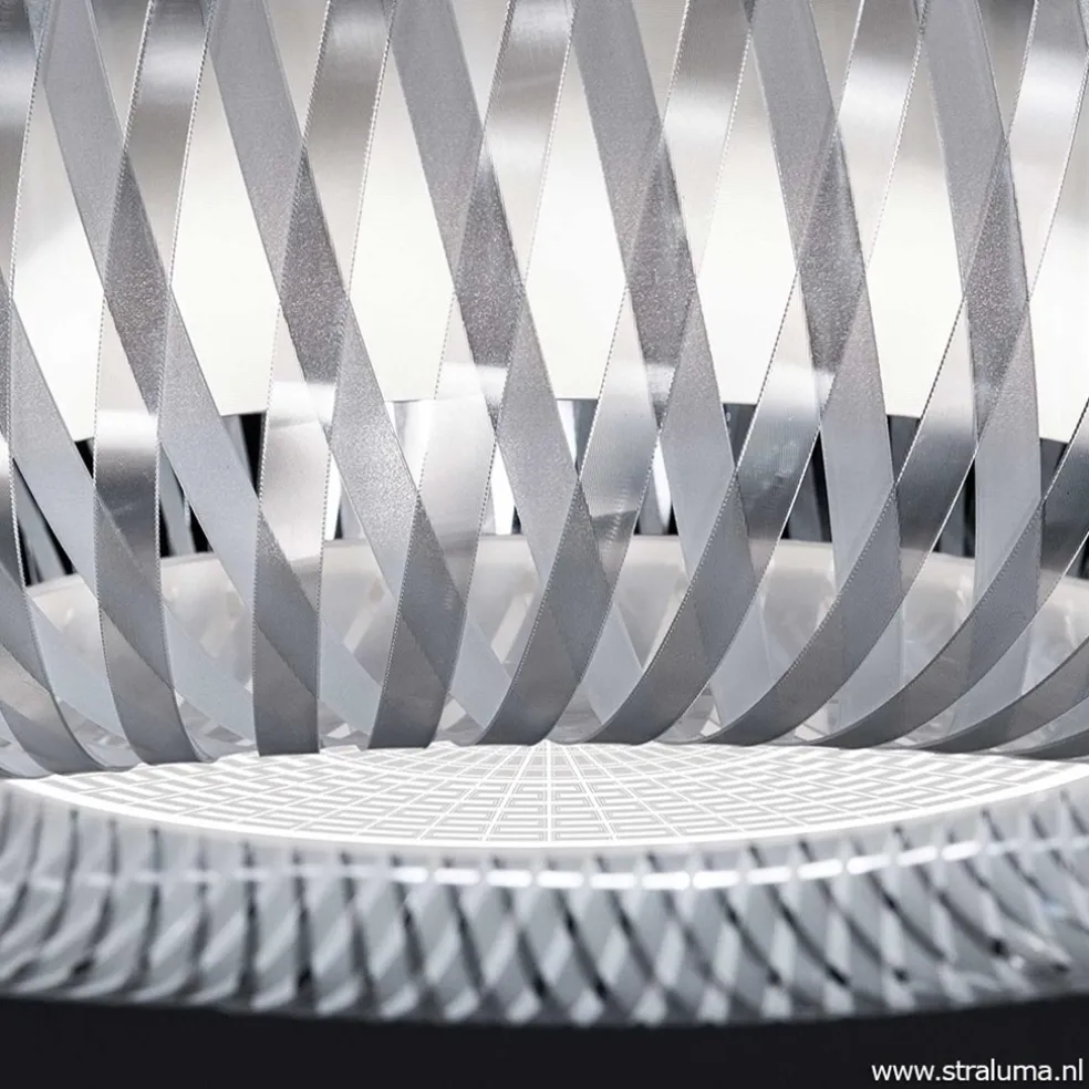 Italiaans design met een gevoel voor authenticiteit. Het design is geïnspireerd op de oude techniek van het weven van manden zoals vroeger al werd gedaan. De techniek geeft de lamp een architectonisch design wat de lamp een echte eye-catcher in huis maakt. De kap is voorzien van twee ‘lagen’:de geweven buitenlaag en de kunststof binnenkap waarbinnen zich de lichtbronnen bevinden (exclusief, 4x E27). Het kunststof is voorzien van een metalen finish aan de buitenzijde wat de lamp een robuuste uitstraling geeft, en een glanzende binnenzijde voor een luxe design uitstraling. De kunststof diffuser zorgt voor een fijne sfeervolle lichtverspreiding en tevens dat er niet in de lichtbron kan worden gekeken. De design kap hangt aan drie staaldraden en heeft een transparant snoer. De hanglamp wordt aan het plafond opgehangen met een ronde witte bevestiging.