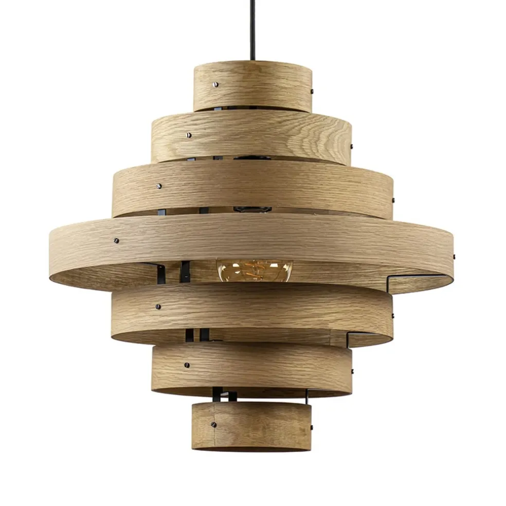 Deze fraaie hanglamp bestaat uit cirkelvormige eiken houten latten. De houten ringen hangen trapsgewijs aan een zwart snoer. De hanglamp heeft een mooie natuurlijke uitstraling. Het snoer van de hanglamp is gemakkelijk in hoogte te verstellen. Hiermee maakt u de lamp passend naar wens. De hanglamp wordt zonder lichtbron geleverd.