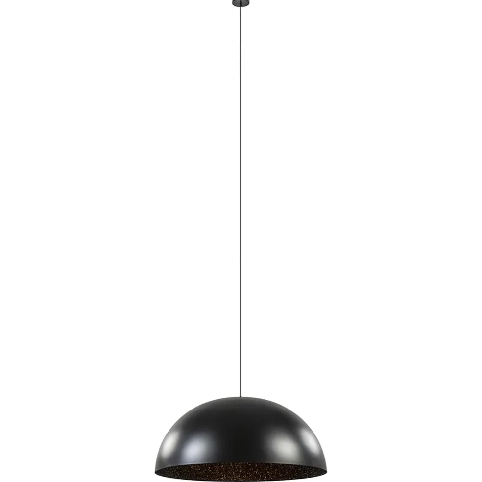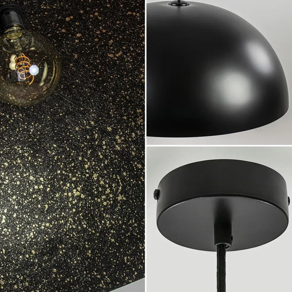 Zeer grote koepel hanglamp van maar liefst 90 cm doorsnede. Deze koepellamp is gemaakt van een composiet en daarmee licht van gewicht. Dit zorgt ervoor dat de lamp eenvoudiger is toe te passen aan meerdere plafondsoorten. De zwarte buitenzijde heeft een matte afwerking. Aan de binnenzijde is de lamp ruwer, zwart en afgewerkt met gouden spetters. Dit geeft de lamp een uniek karakter. Deze grote hanglamp is prachtig boven een grote ronde tafel.