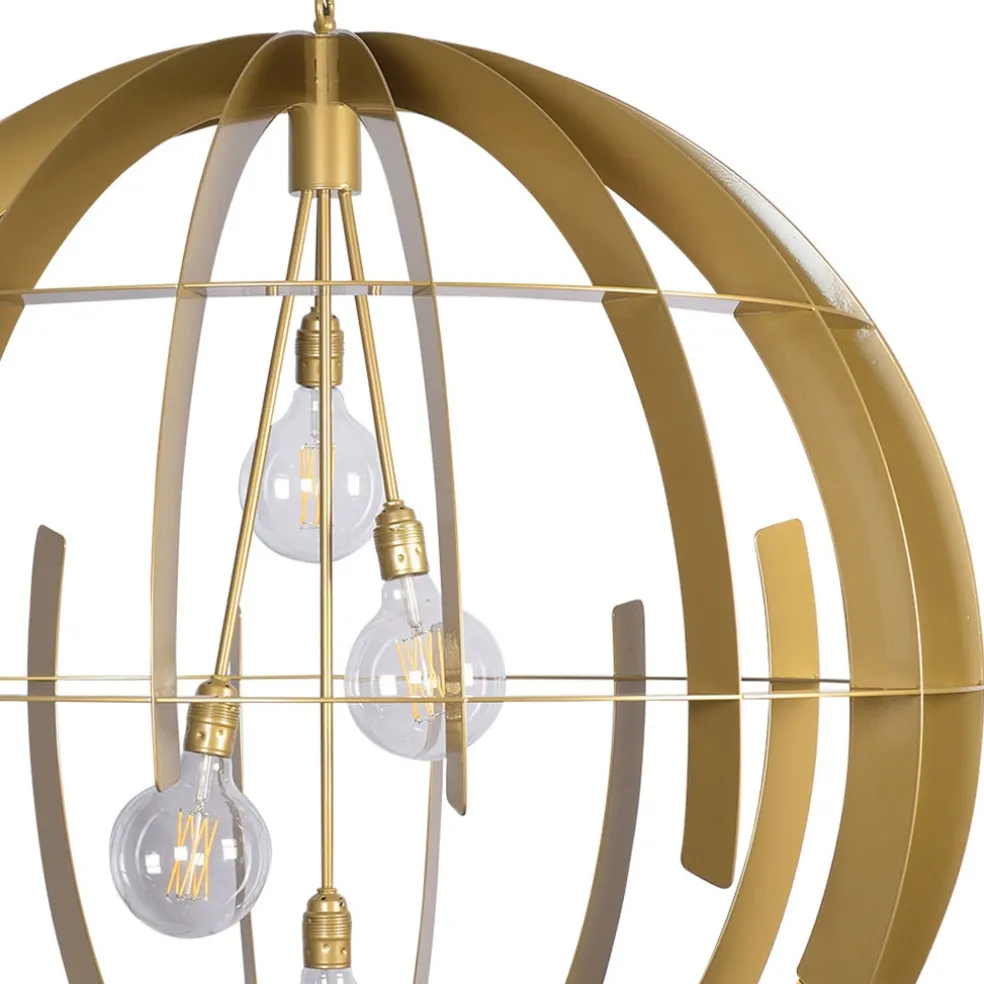 Deze schitterende hanglamp is een echte eyecatcher. De bol heeft een doorsnede van 100 cm en is gemaakt van platte ribben. Uit de bol zijn echter 2 cirkels weggelaten. Dit geeft de lamp een speels uiterlijk en zorgt ervoor dat de lamp er van elke kant anders uitziet. Deze grote hanglamp zou prachtig zijn boven een grote ronde tafel of in een vide. De gouden lamp past in een strak-klassiek, modern of design interieur.