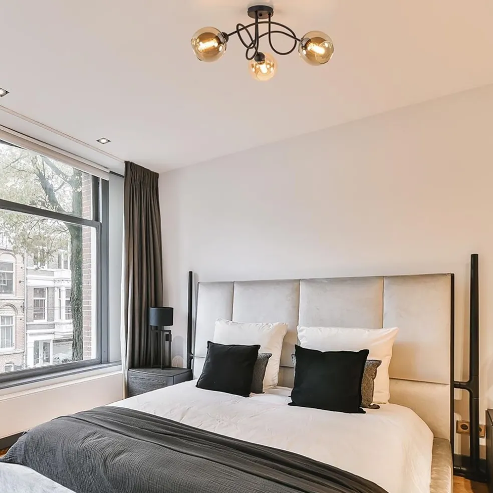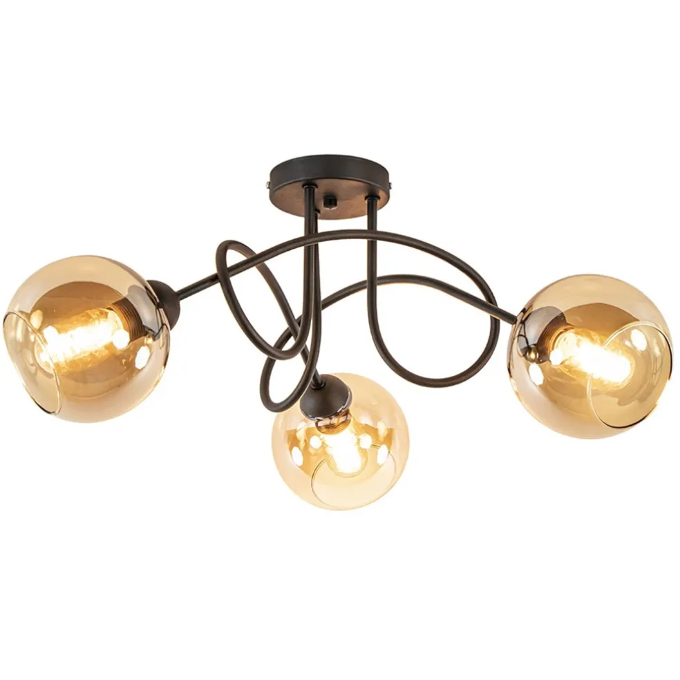 Sierlijke trendy 3-lichts plafondlamp. Deze mat zwarte plafondlamp met amber kleurig glas is een echte eyecatcher. Het amber kleurige glas geeft de lamp een mooie warme gloed. Het fraaie armatuur loopt krullend in elkaar over. De lamp is leuk voor in een slaapkamer of een hal en matcht mooi in een klassiek of retro interieur. De sierlijke lamp wordt exclusief lichtbronnen geleverd en is dimbaar middels een externe dimmer (exclusief).