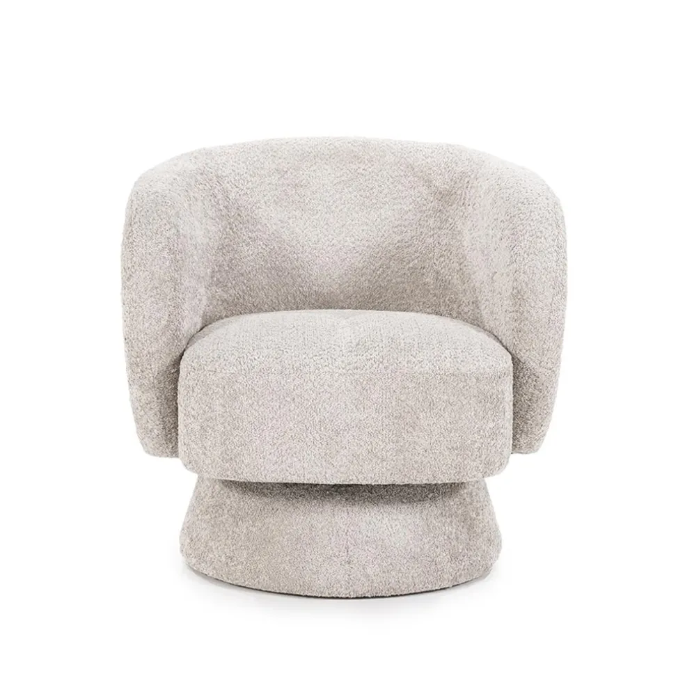 Wat een leuk fauteuiltje, deze hoog knuffelbare Balou. Helmaal volgens de laatste trends in een wollige taupekleurige stof en gestoffeerde voet. Hij weegt 24 kg dus is makkelijk in huis te verzetten. Er bestaat ook een voetenbankje waardoor je dit stoeltje zo omtovert in een lounge stoel.