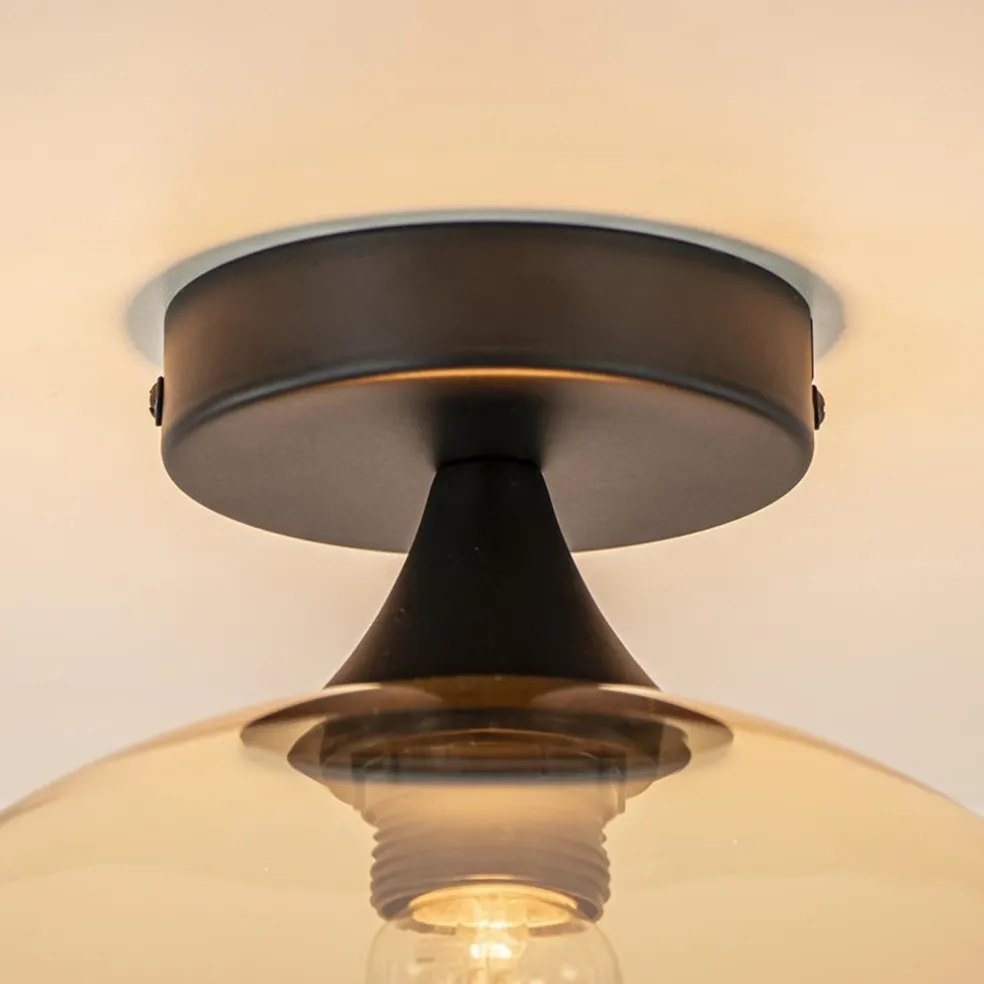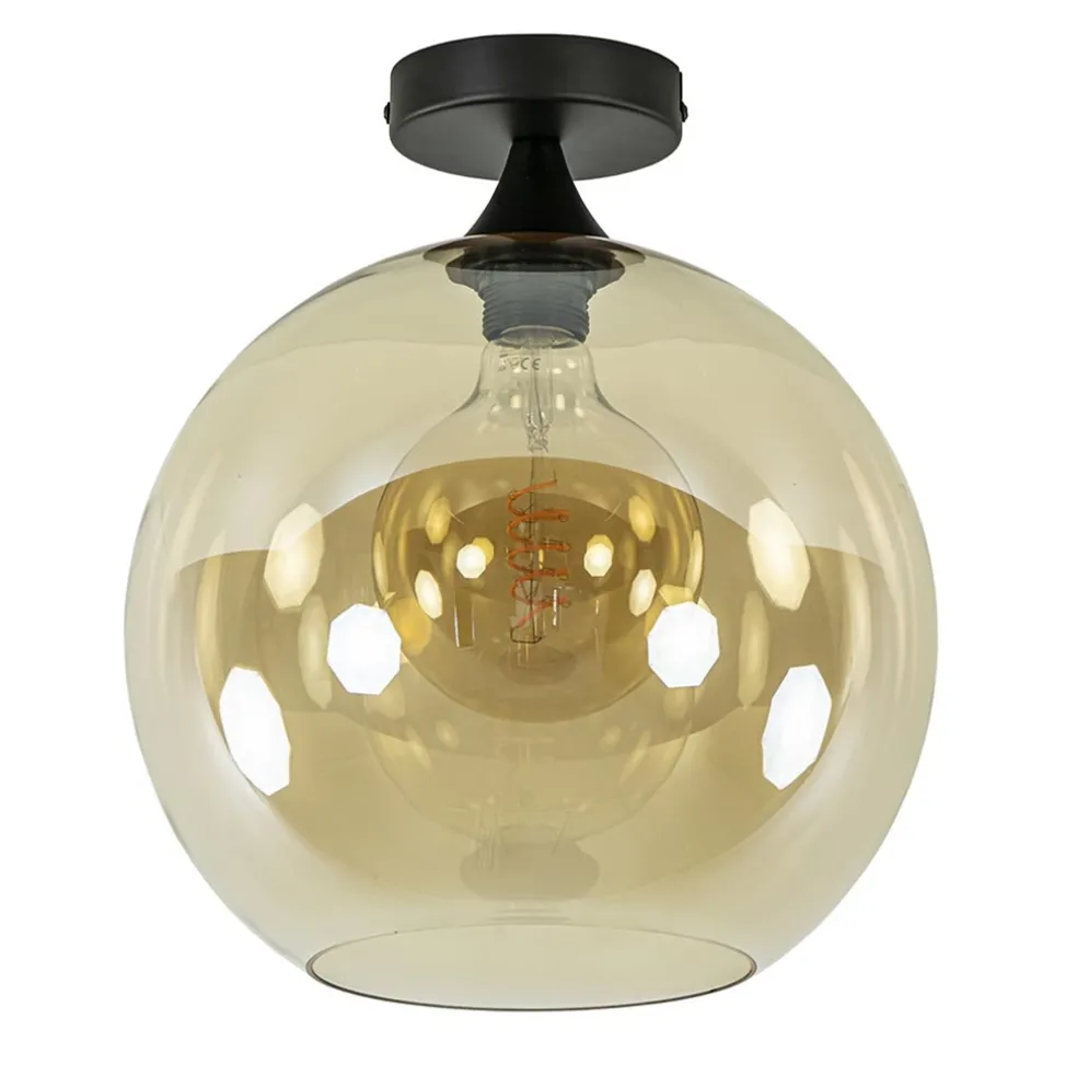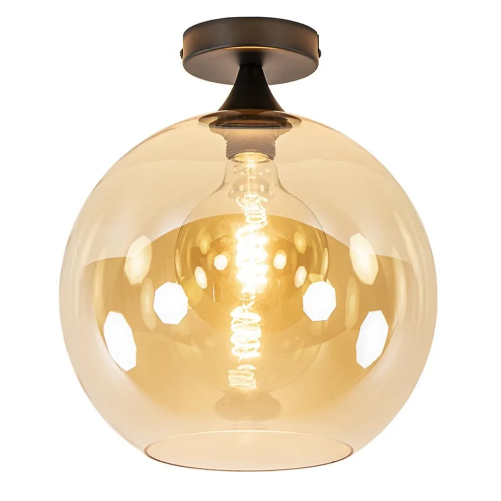 Mat zwarte plafondlamp met amber glazen bol 30 cm