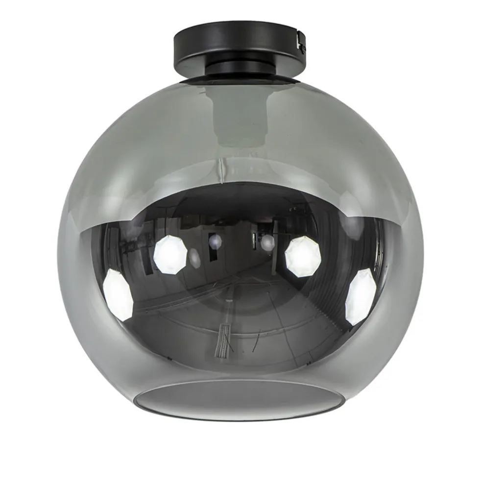 Een beetje extra luxe in de hal of slaapkamer? Dat kan met deze prachtige plafondlamp. De lamp bestaat uit een mat zwarte ronde bevestiging van 11 cm doorsnede en een smoke glazen bol van 30 cm doorsnede. Het glas heeft een titanium coating wat die extra luxe uitstraling geeft. Enerzijds geeft het een spiegelend effect en anderzijds wordt het glas donker transparant wanneer de lamp is ingeschakeld. De ronde plafondlamp is dimbaar middels een externe dimmer (exclusief) en wordt geleverd exclusief lichtbron.