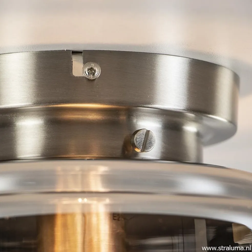 Een moderne plafondlamp met een retro tintje. De art deco achtige plafondlamp, vaak in helder of wit glas, wordt nu ook uitgevoerd in het trendy smokey glas. Het spiegelende smokey glas zorgt voor een moderne en luxe uitstraling die mooi past bij de matte nikkel bevestiging. De combinatie van het moderne en retro zorgt dat de lamp mooi is toe te passen in diverse woonstijlen en ook in diverse ruimtes. Ideaal in een hal of woon/slaapkamer.