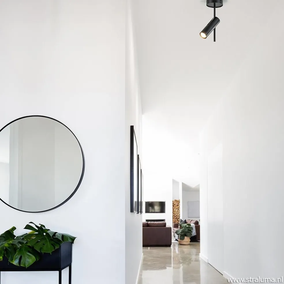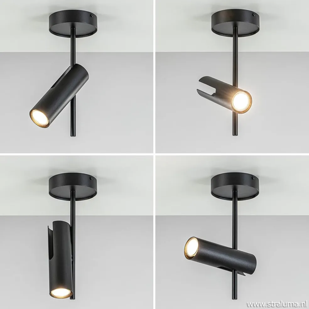 Een moderne plafondspot met een uniek design. De plafondlamp is volledig van metaal en uitgevoerd in mat zwart. Het unieke design maakt dat de spot in verschillende manieren is te verstellen. Zo is de kap te kantelen en te draaien waarbij de opbouwspot op iedere manier een andere vorm/look krijgt. Ideaal wanneer u iets wilt uitlichten of de lamp als extra sfeerlicht wilt plaatsen. De moderne plafondlamp leent zich prima voor een ruimte als een hal of toilet, maar ook in de woon- of slaapkamer kan de plafondspot prima worden toegepast. De zwarte spot wordt geleverd zonder lichtbron (GU10).