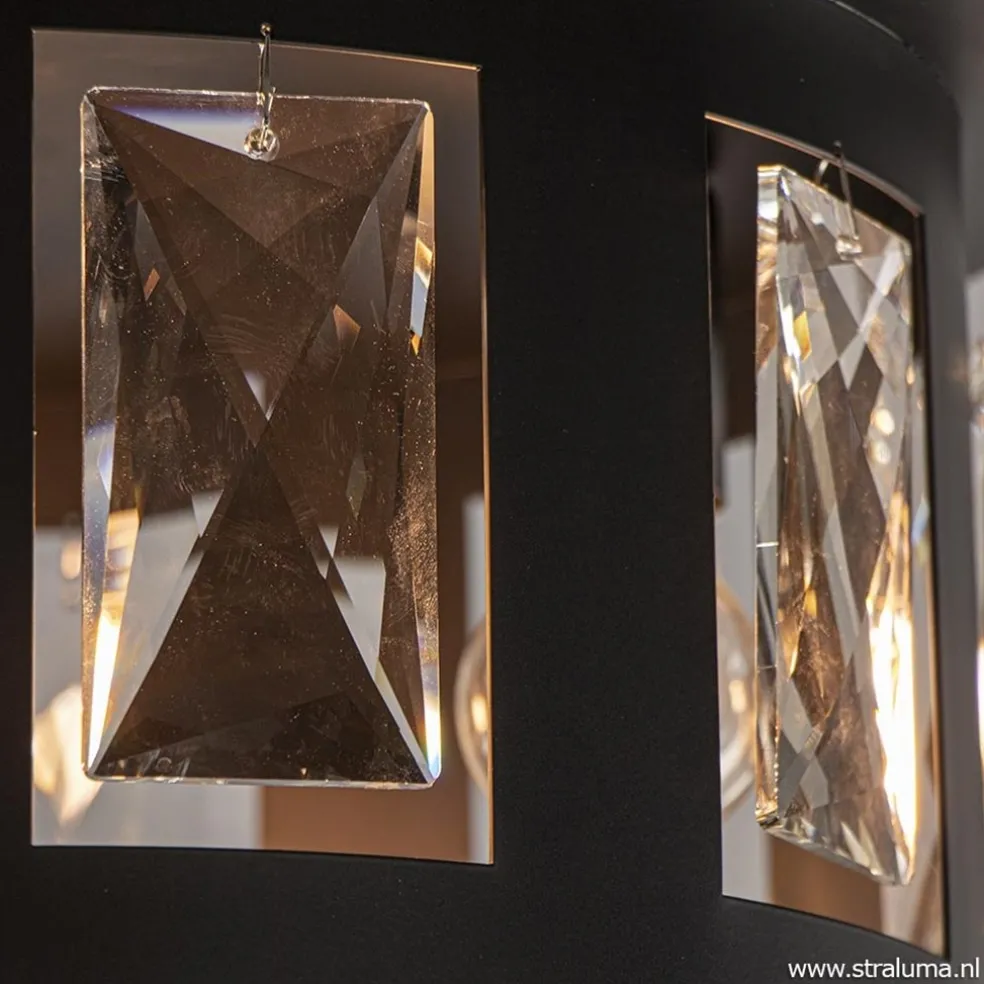 Een moderne plafondlamp met een klassieke knipoog. De plafondlamp is gemaakt van metaal en afgewerkt met een mat zwarte finish die het moderne gevoel versterkt. De lamp heeft als versiering 9 glazen pegels die zijn geslepen als kristal en daardoor ook hetzelfde effect geven. Dit zorgt voor een mooie sfeervolle verlichting en geeft de lamp een chique karakter. De mat zwarte plafondlamp past mooi in een ruimte als de woonkamer of slaapkamer. De lamp wordt geleverd exclusief lichtbron (3x E27).