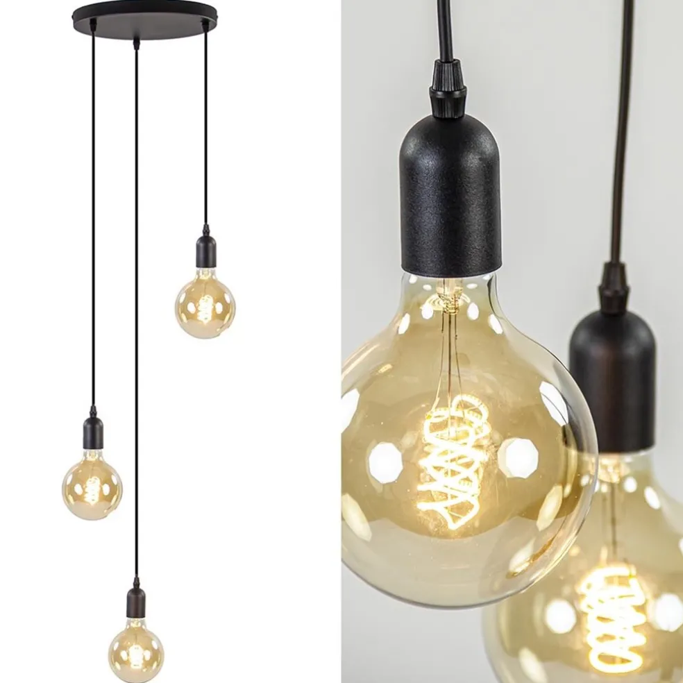 Een lichtbron hoeft niet meer verstopt te zitten in een kap. Lichtbronnen worden steeds sfeervoller en mogen gezien worden. Zo ook bij deze 3-lichts hanglamp. De sfeer wordt bepaald door de keuze in lichtbron, en daar is genoeg keuze in. De hanglamp is een gezellige sfeermaker en kan naar wens op hoogte worden opgehangen. De metalen fittingen hangen aan een zwart snoer en de lamp wordt aan het plafond bevestigd met een metalen ronde plaat. De lamp leent zich prima voor boven een salon- of bijzettafel en kan in verschillende woonstijlen worden gecombineerd.
