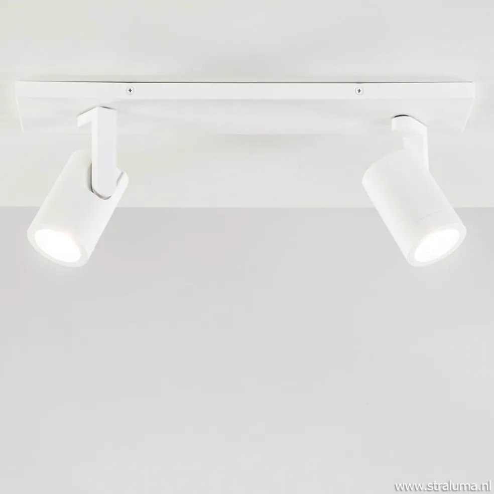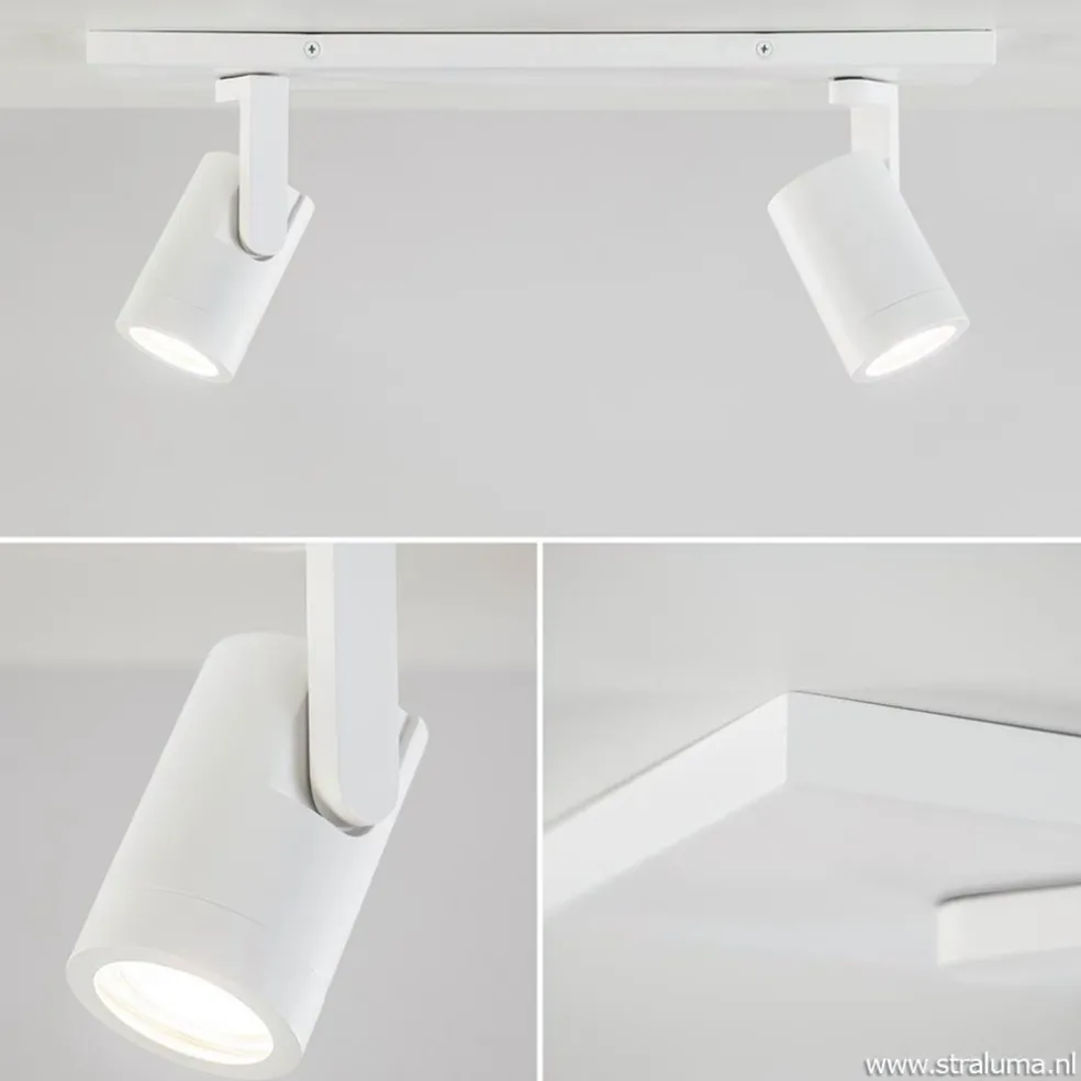 Een fijne plafondspot voor in een hal of slaapkamer. Deze moderne opbouwspot is volledig afgewerkt in mat wit wat de plafondlamp een moderne en strakke look geeft. De spots zijn zowel te kantelen als te draaien zodat u ze altijd naar de gewenste richting kunt laten verlichten. De ronde spotjes zijn voorzien van een afneembare ring die u er gemakkelijk afdraait zodat de lichtbron kan worden geplaatst en zitten bevestigd op een L-vormig pootje. De metalen plafondspot heeft een smalle en platte bevestiging die de strakke moderne look extra benadrukt. De 2-lichts witte opbouwspot wordt geleverd zonder lichtbronnen (2x GU10).