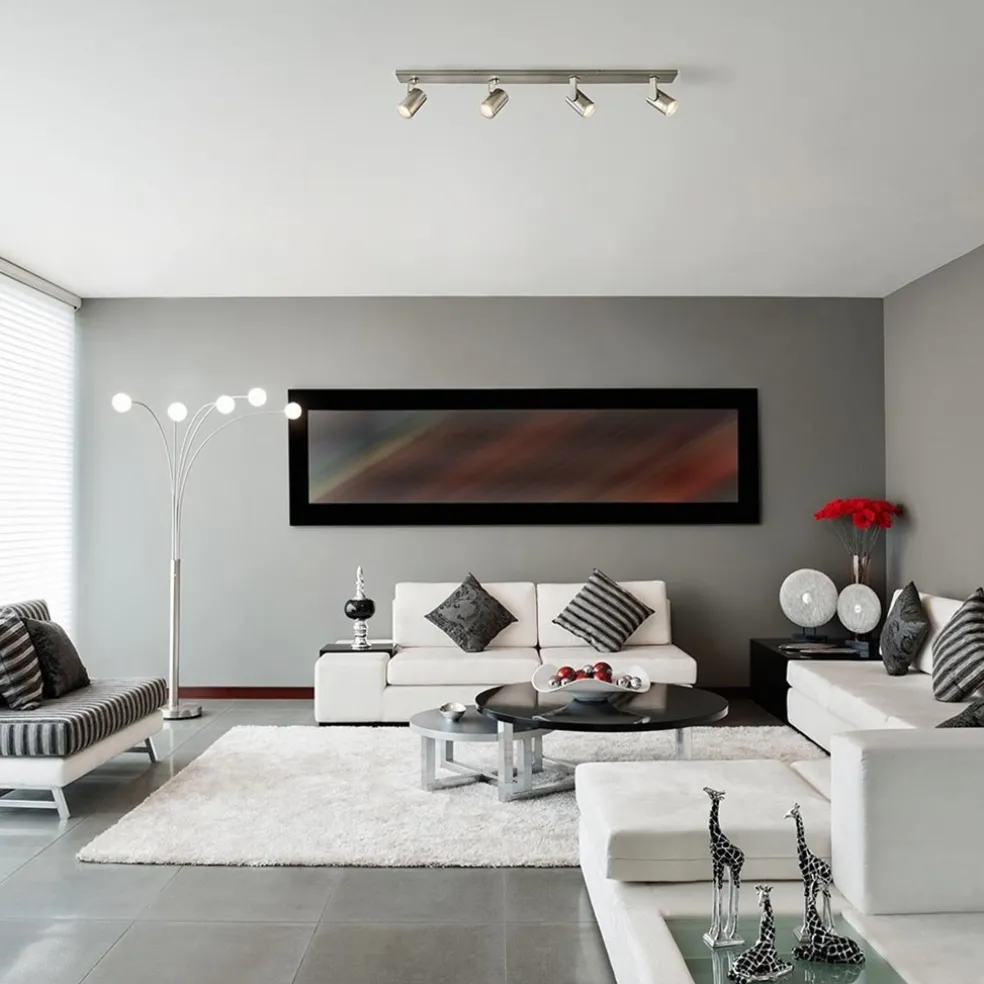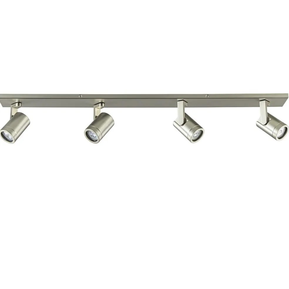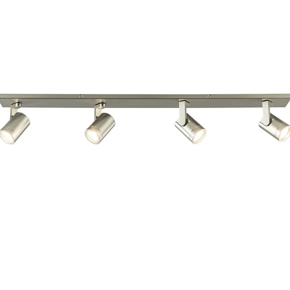 Ideaal voor in een lange smalle kamer of hal. Deze 4-lichts opbouwspot zorgt voor voldoende licht en doordat de spots zowel te kantelen als te draaien zijn, stelt u de spots gemakkelijk en snel naar de juiste richting. De ronde spots zijn voorzien van een afneembare ring zodat de lichtbron gemakkelijk geplaatst kan worden. De metalen kapjes zijn bevestigd op een L-vormig pootje die is bevestigd op de metalen plafondbalk. De plafondspot krijgt door de matte nikkel afwerking een strakke look die mooi past in diverse woonstijlen.