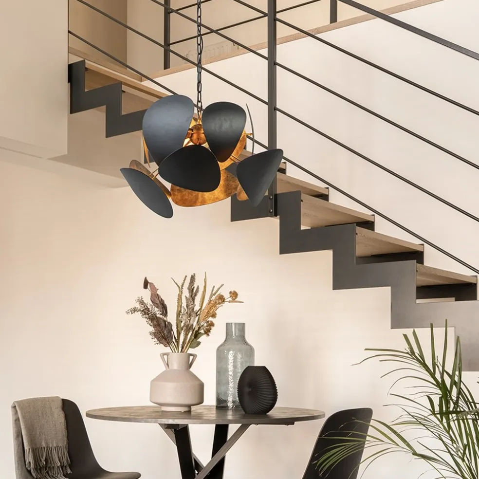 Futuristisch van design en elegant van uitvoering. Deze robuuste hanglamp is een ware eyecatcher in het interieur. De lamp is door z’n hoogte van 230 cm in diverse ruimtes toe te passen, van de eetkamer tot de hal of vide. De ronde hanglamp is volledig gemaakt van metaal en uitgevoerd in het textured black met ambachtelijk brons. Dit geeft de lamp een stoere robuuste uitstraling die mooi matcht in een luxe, chic of industrieel interieur. De hanglamp is in hoogte te verstellen door er schakels tussenuit te halen. De kap is van binnen voorzien van 3 E27 fittingen en een GU10 spot aan de onderzijde van de kap. Deze kunt u gemakkelijk bedienen met de drukknop op het armatuur. De robuuste hangllamp wordt geleverd zonder lichtbronnen en is dimbaar middels een externe dimmer (exclusief).