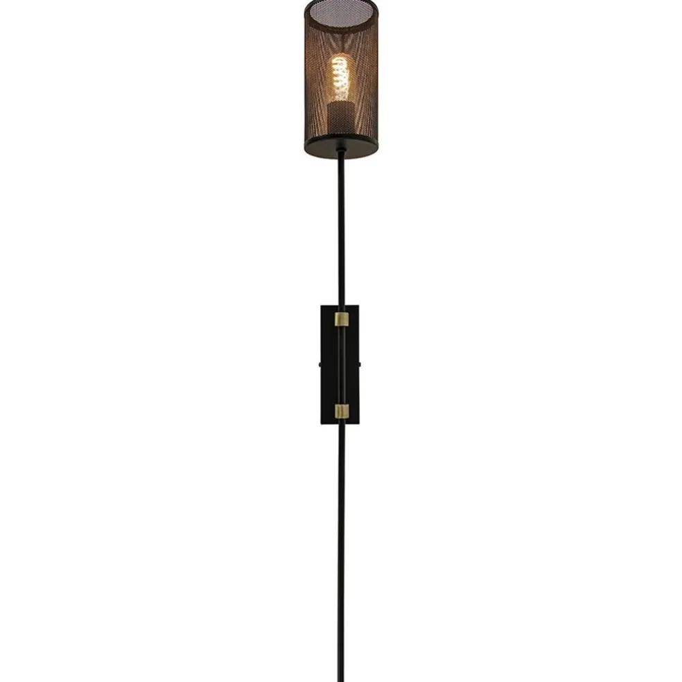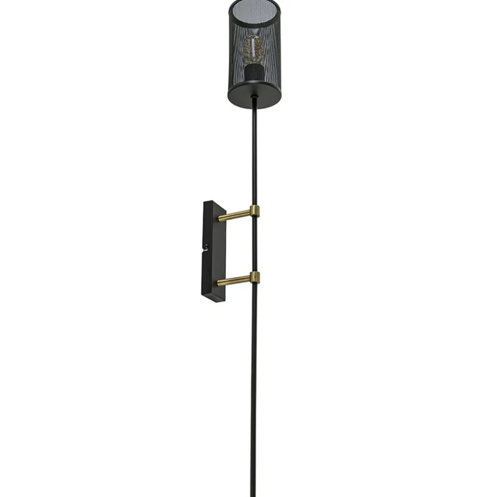 Deze stoere wandlamp is een verrijking voor het interieur. De wandlamp is gemaakt van metaal en uitgevoerd in het mat zwart. Het armatuur is gecombineerd met een cilinder vormige kap met metaalgaas. Dit geeft de lamp een industriële look. De gouden armen zorgen daarentegen voor een chique touch aan de lamp. De wandlamp heeft een hoogte van 100 cm en is niet voorzien van een snoer. De mat zwarte wandlamp wordt geleverd exclusief lichtbron.