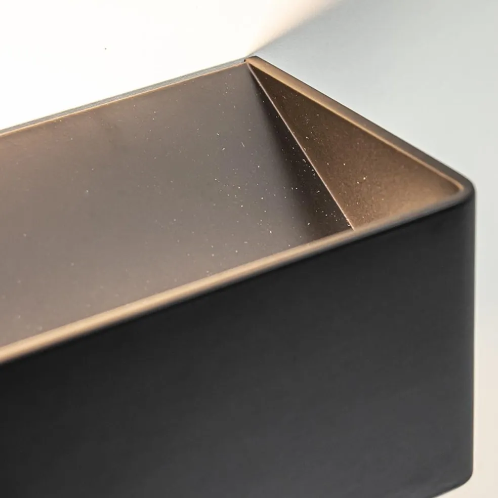 Een minimalitisch design met een sfeervol effect. Deze moderne wandlamp zorgt door het zandloper effect op de muur voor een fijne sfeerverlichting. De mat zwarte wandlamp is rechthoekig en van binnen voorzien van LED verlichting. Het LED geeft met 2700 Kelvin warm witte verlichting en zorgt met 600 lumen voor een prima lichtopbrengst. Het matte zwart zorgt dat de rechthoekige LED wandlamp mooi overloopt op een donkere wand, of juist meer opvalt op een contrasterende kleur. De zwarte wandlamp heeft geen snoer en dient direct op een stroompunt te worden aangesloten. Ideaal voor extra sfeer in de woonkamer, hal of slaapkamer.
