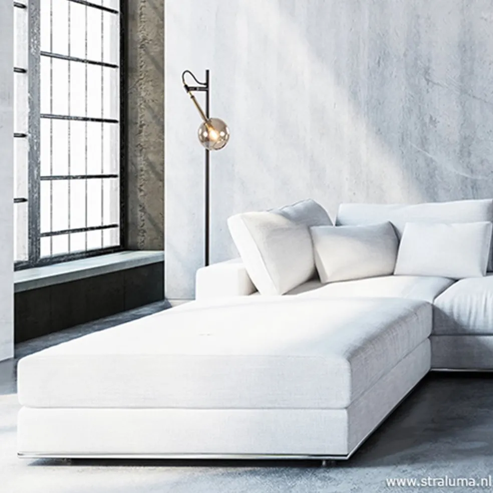 Helemaal passend binnen de huidige trends en mooi te combineren in diverse woonstijlen. Deze metalen vloerlamp is afgewerkt met een mat zwart gepoedercoate finish die de staande lamp een moderne strakke look geeft. Het matte zwart is gecombineerd met goud wat nu veel te zien is in interieurs en daardoor zowel klassiek als modern toepasbaar is. Aan de gouden/messing arm hangt de mondgeblazen glazen smoke kap en de arm is verstelbaar door ze te kantelen. Zo kan u steeds de lamp een beetje anders maken. Deze moderne vloerlamp wordt geleverd inclusief zwart snoer met vloerdimmer.