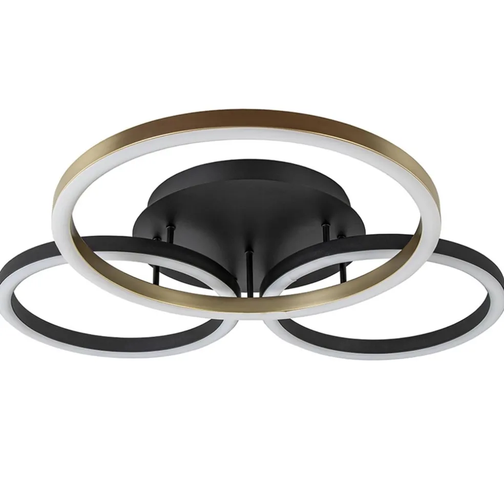 Een chique plafondlamp die prima past in diverse woonstijlen. De LED plafondlamp bestaat uit 3 ringen in diverse afmetingen die elkaar overlappen, dit geeft de lamp een speelse look. De ringen zijn uitgevoerd in het zwart en goud. De design plafondlamp is verder voorzien van een 3-standen dimfunctie. Dit houdt in dat u de lamp met de gewone wandschakelaar kunt dimmen, er is geen externe dimmer voor nodig. De techniek zit verwerkt in de lamp zelf en dimt een stap verder zodra u de wandschakelaar overhaalt. Door z’n grootte is de LED plafondlamp met ringen een mooi toevoeging voor een hal of slaapkamer.