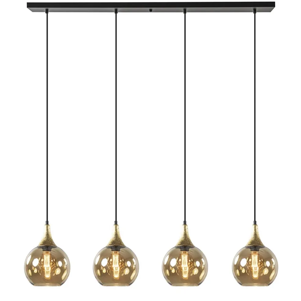 Deze prachtige 4-lichts hanglamp is een mooie toevoeging aan een chic of klassiek interieur. De hanglamp heeft een zwart armatuur en is voorzien van zwarte stof omwonden snoeren. Deze zijn naar wens in te korten, de maximale hoogte van de lamp is 150 cm. De 4 lichtpunten zijn afgewerkt met een pendel met bladgoud look die mooi is gecombineerd met amber glazen bollen. Deze hebben een doorsnede van 20 cm en zijn van onder open om gemakkelijk de lichtbron te plaatsen. De 4-lichts glazen hanglamp past perfect boven een eettafel vanaf 2,2 meter. De amber glazen hanglamp is dimbaar middels een externe dimmer (exclusief) en wordt geleverd exclusief lichtbron.