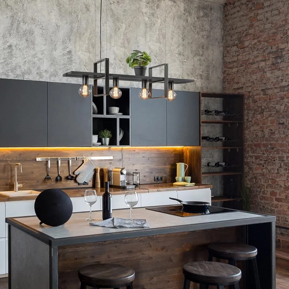 Perfect voor boven een kookeiland of eettafel. De langwerpige hanglamp met frame zorgt voor zowel sfeer als extra decoratie. De hanglamp is namelijk voorzien van twee houten planken waar u leuk een plantje of decoratie op kunt zetten. De planken worden los op het frame gelegd dus het is aan te raden om niet al te zware dingen erop te zetten. Het frame is gemaakt van metaal en uitgevoerd in het mat zwart. De combinatie van het zwart en hout maakt de lamp geschikt voor diverse woonstijlen. Het frame is aan de onderzijde voorzien van vier E27 fittingen en hangt aan vier staaldraden waarmee u de hoogte gemakkelijk kunt verstellen. De grote metalen bevestiging maakt de lamp helemaal af.