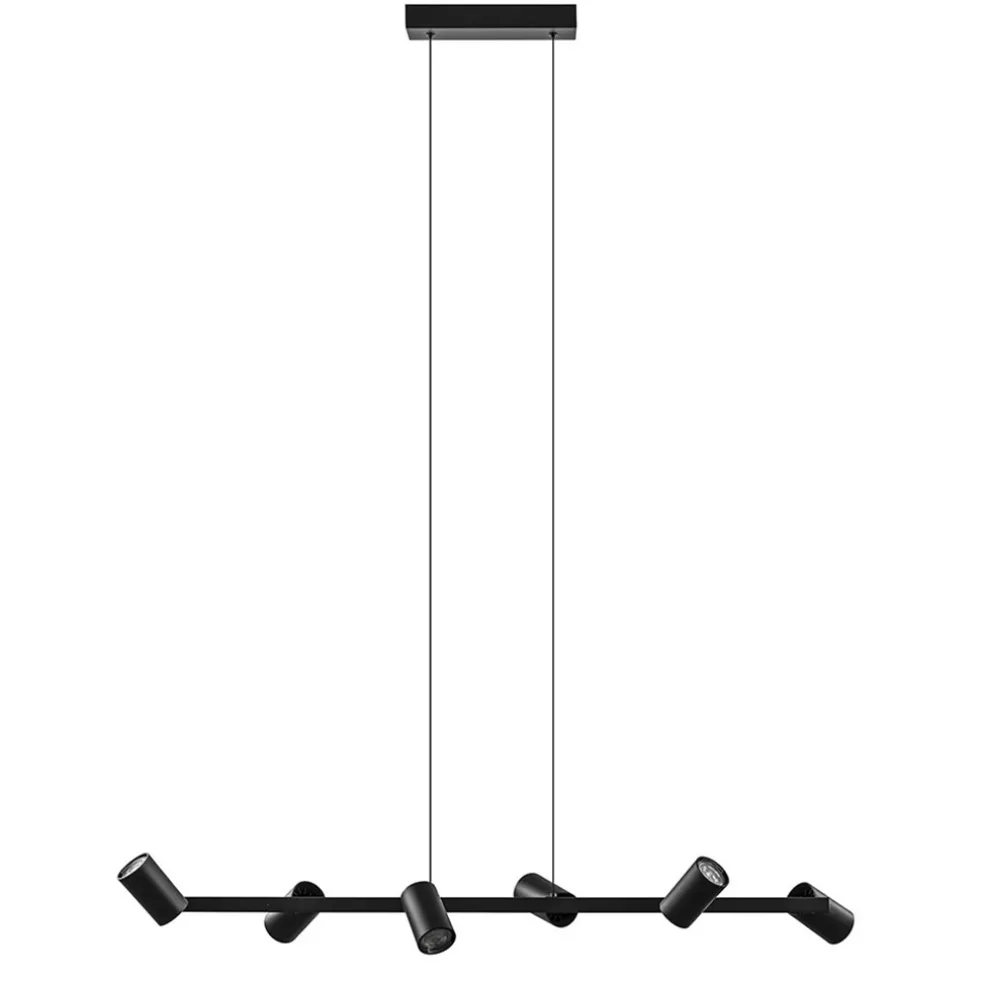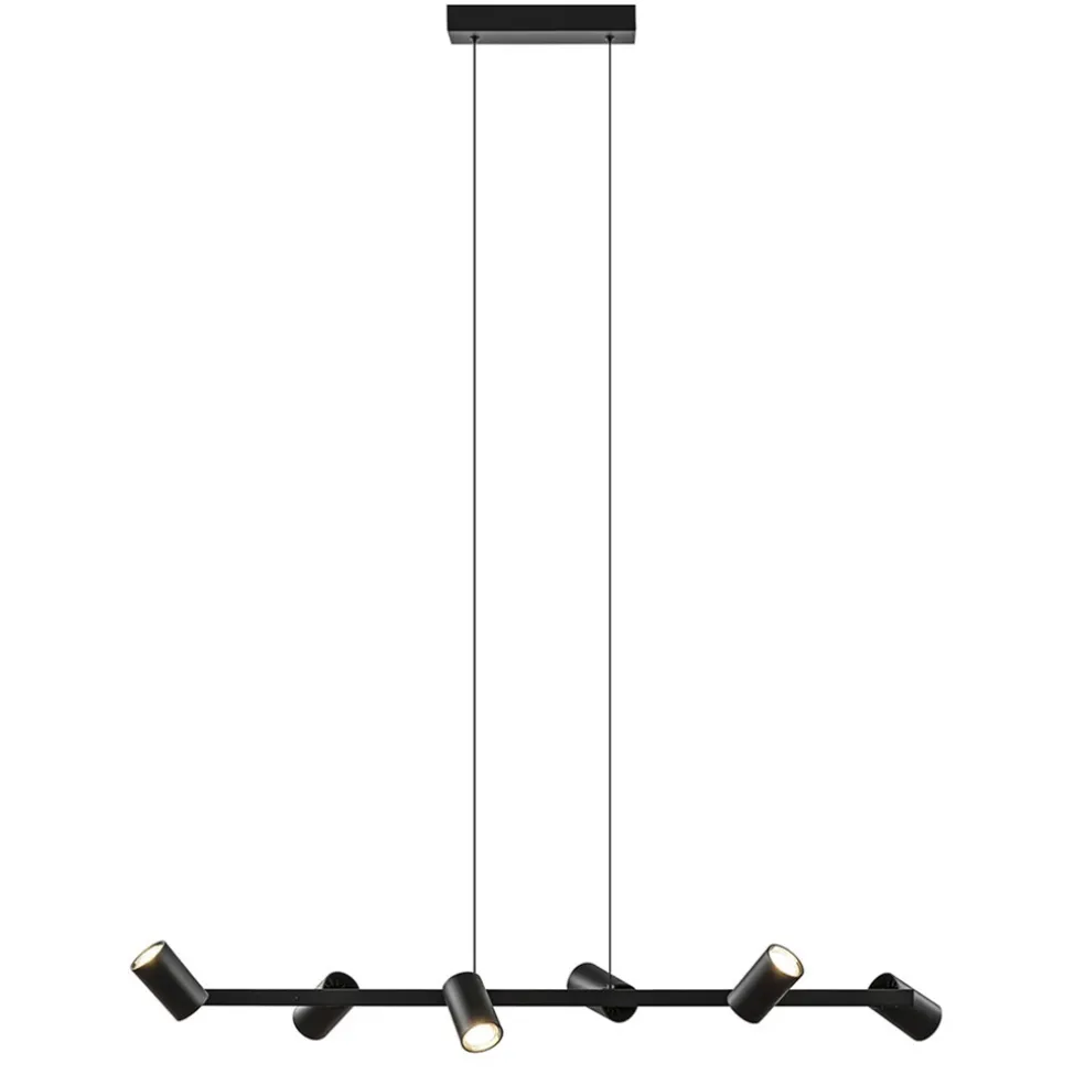Een strak design met een hoge functie waarde. Deze 6-lichts hanglamp is voorzien van 6 spots die naar wens zijn te verstellen. De spots kunnen draaien en kantelen zodat u zelf kunt kiezen hoe u de spots wilt plaatsen. Ideaal om zowel de ruimte als het oppervlak onder de lamp goed uit te lichten. De hanglamp is gemaakt van metaal en heeft een maximale hoogte van 200 cm. De hoogte is gemakkelijk in te korten zodat u de lamp kunt toepassen boven een eettafel, kookeiland of in een kantoorruimte. De 6-lichts hanglamp spots wordt geleverd exclusief lichtbronnen en is dimbaar middels een externe dimmer (exclusief).