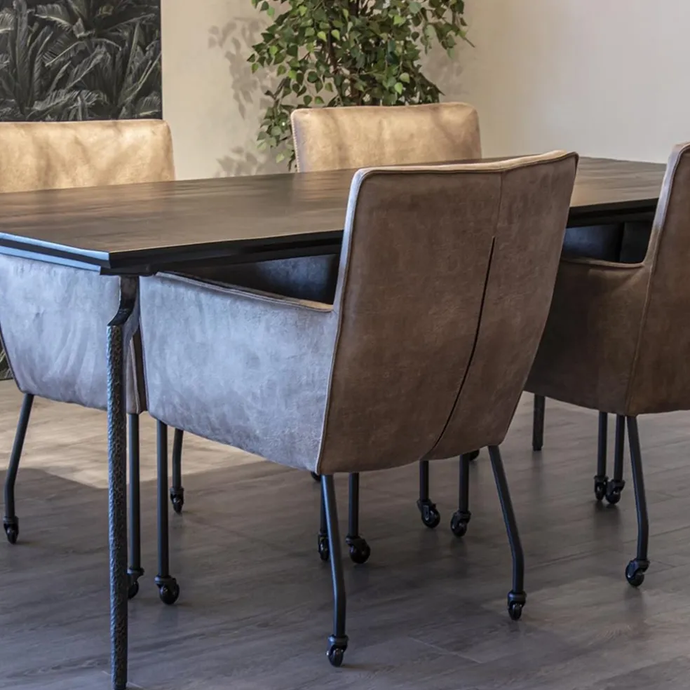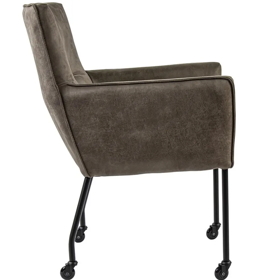 Een hele fijne eetkamerstoel om in te dineren, natafelen of zelfs te werken aan tafel. De armstoel is voorzien van wieltjes wat het aanschuiven gemakkelijk maakt. De zitting is volledig van bull leder en daardoor heel zacht. Bull leder, ook wel eco leer genoemd, is een combinatie van gerecycled buffelleer en polyester stof waardoor er een stevige kwaliteit ontstaat maar wel enorm zacht aanvoelt. Ook de armleuningen maken het natafelen nog fijner. Het bull leder is uitgevoerd in het liver en de slanke metalen pootjes in het zwart.