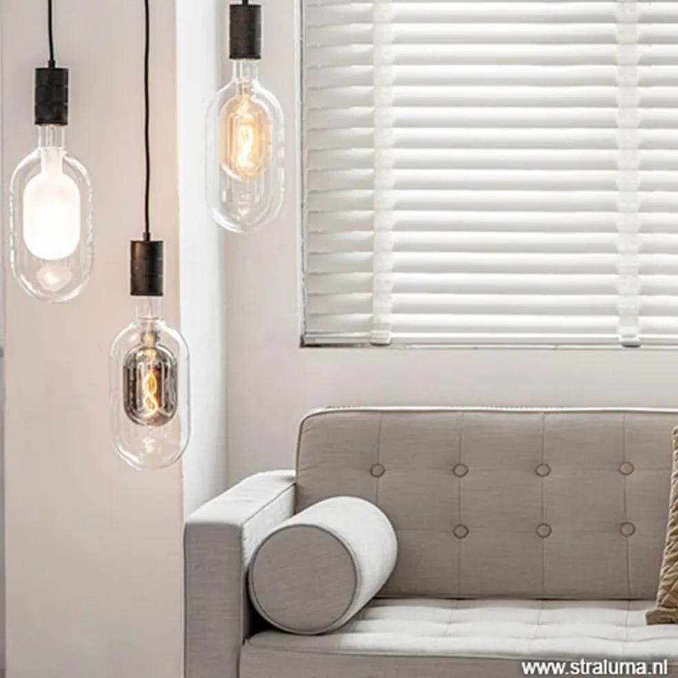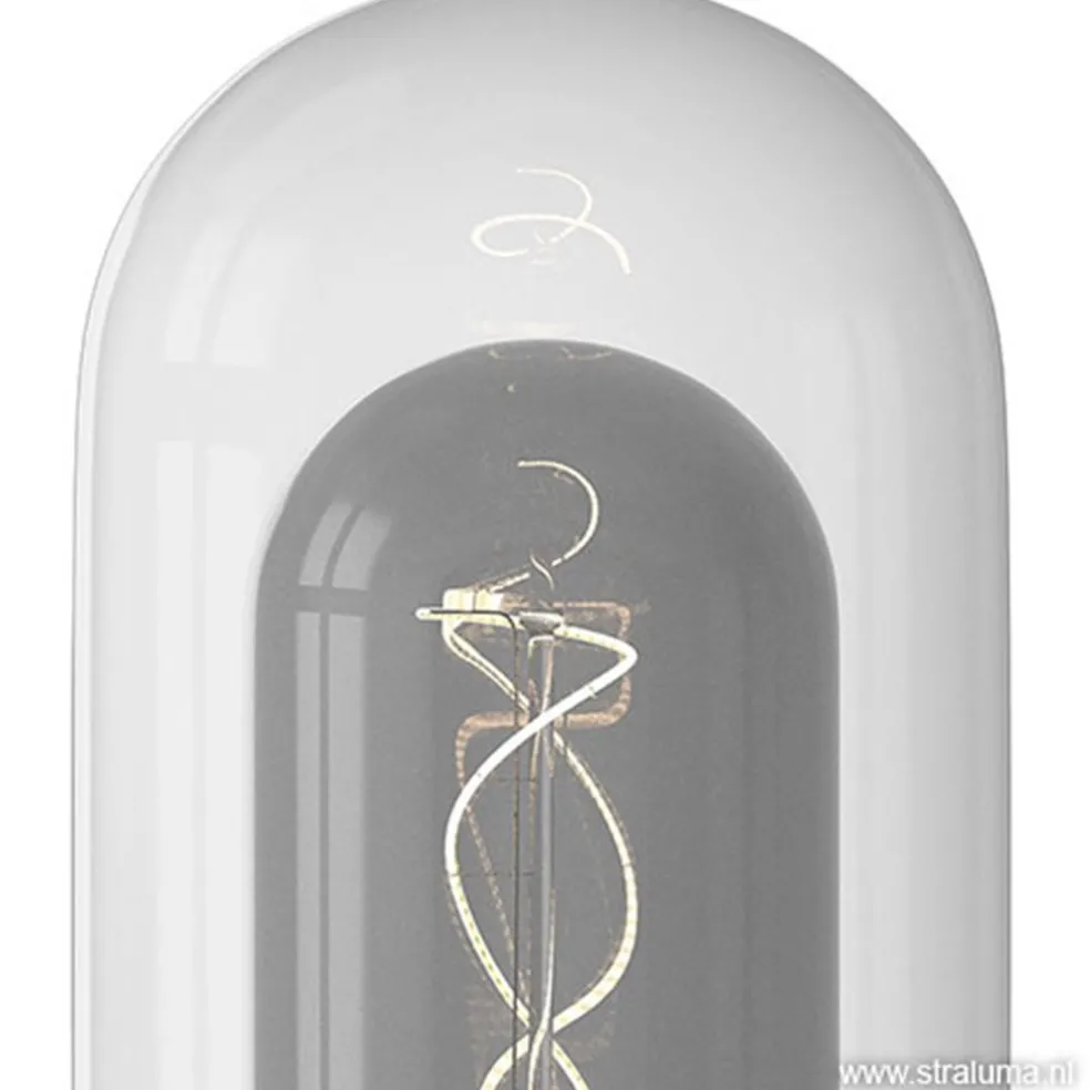 Het dubbele glas van deze lichtbron is moeilijk te maken. Het lamp-in-lamp effect is echter zeer de moeite waard. Het zorgt voor een mooie reflectie van het licht. Prachtig in een eenvoudige pendel, maar ook mooi in een grote groep. Deze design lichtbron geeft, ondanks het koele glas, mooi extra warm licht. Het buitenste glas is helder, het binnen glas heeft een diepe titanium glans.