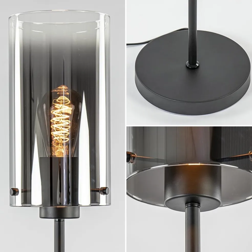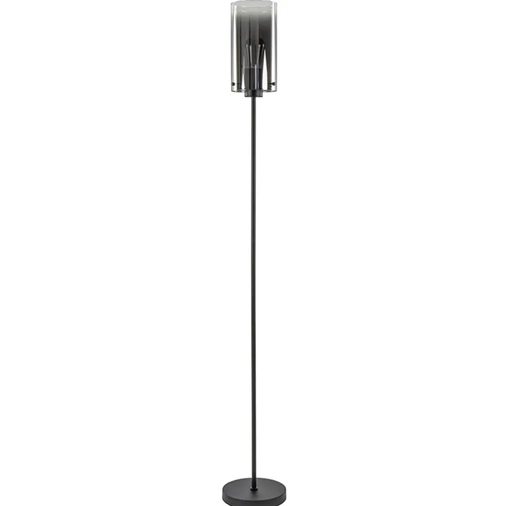 Een moderne vloerlamp met een luxe en chique uitstraling. De vloerlamp bestaat uit een mat zwarte metalen voet met een cilinder vormig smoke glas. In het glas zit een mooi verloop van licht naar donker. Dit geeft de vloerlamp een extra luxe uitstraling die mooi te combineren is in een strak klassiek, modern of chique interieur. Een mooie sfeervolle toevoeging aan uw interieur.