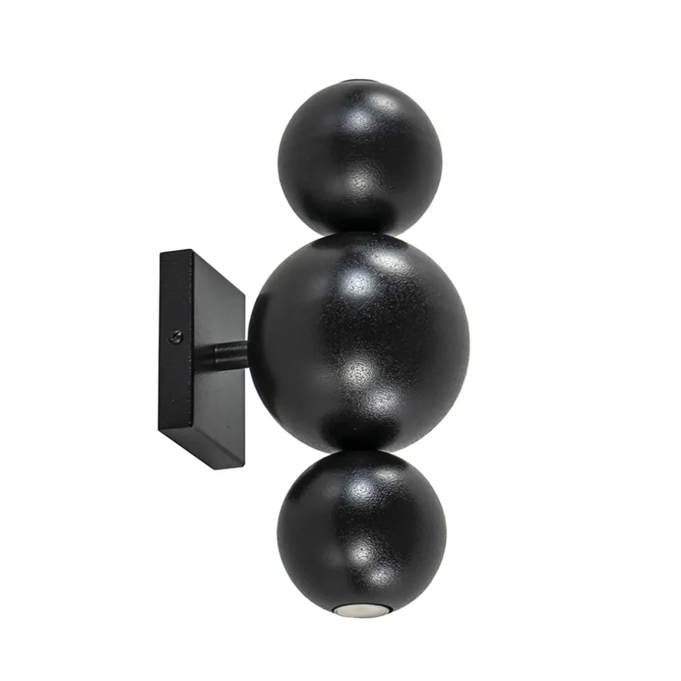 Klein van stuk maar groots in effect. Deze design wandlamp zorgt voor een sfeervol effect in de ruimte. De wandlamp bestaat uit 3 metalen bollen die zijn bevestigd op een wandplaat. De bovenste en onderste bol zijn voorzien van een E14 lichtpunt inclusief LED lichtbron. De wandlamp functioneert dan ook als een up en downlighter. Ideaal voor in een hal, woonkamer of slaapkamer. De wandlamp is volledig gemaakt van metaal en uitgevoerd in het textured black wat een stoere robuuste uitstraling geeft. De wandlamp is niet voorzien van een snoer.