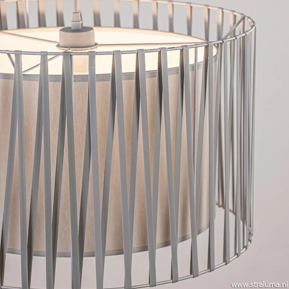 Prima geschikt voor een modern of Scandinavisch interieur. De kap van de moderne hanglamp bestaat uit twee delen, een metalen buitenframe waar een draad overheen gewikkeld is voor een speels effect, en de stoffen binnenkap. De binnenkap zorgt voor een sfeervolle lichtverspreiding en tevens dat er niet direct in de lichtbron kan worden gekeken. De grijze kap hangt aan een grijs snoer die in hoogte is te verstellen en wordt aan het plafond bevestigd met een ronde metalen bevestiging. De lamp leent zich prima voor een ruimte als de woonkamer, slaapkamer, keuken of hal.