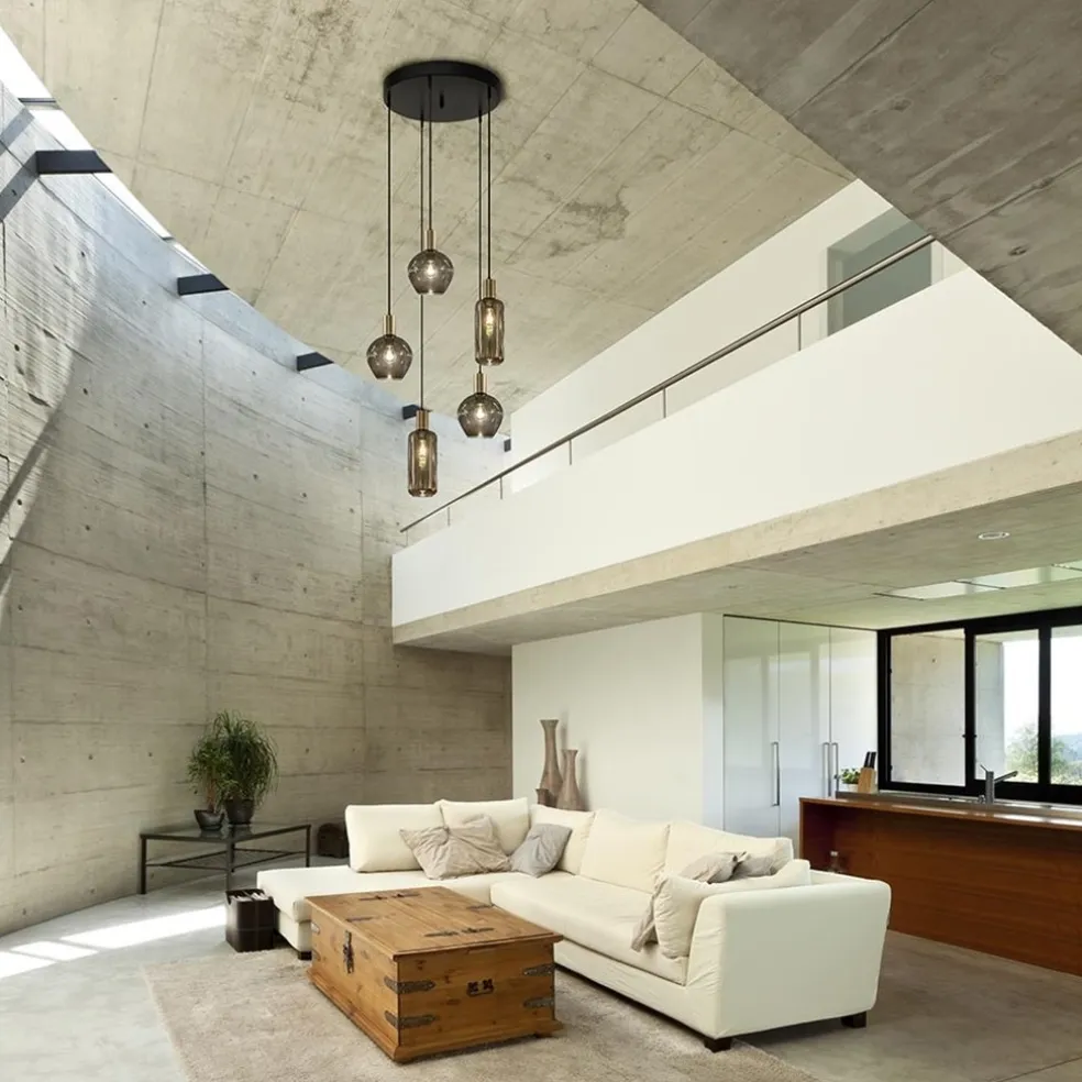 Een prachtige hanglamp voor een vide of hoge ruimte. Deze 5-lichts hanglamp heeft een stijvolle look die mooi matcht in diverse woonstijlen als klassiek, hotel chic of luxury. De vijf snoeren zijn naar wens op hoogte te hangen, met een maximale hoogte van 3,5 meter. De videlamp is voorzien van vijf smoke glazen kappen verdeeld over twee afmetingen. Het donkere glas is gecombineerd met een bronzen fitting wat de lamp een extra chique uitstraling geeft. De 5-lichts videlamp wordt bevestigd met een grote ronde plaat van 50 cm doorsnede en is dimbaar middels een externe dimmer (exclusief).