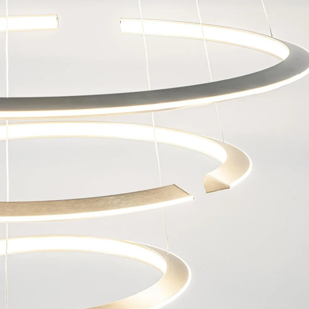 Een grote hanglamp met een uniek design. Deze moderne ronde hanglamp bestaat uit drie nikkel ringen die naar wens op hoogte zijn te hangen. Iedere ring is voorzien van een opening om de lamp nog opener en ruimtelijker te laten ogen. De ringen zijn zowel van binnen als van buiten voorzien van LED strips die met 2700 Kelvin zorgen voor een sfeervolle warm witte verlichting. De ringen hangen aan drie staalkabeltjes die gemakkelijk zijn in te korten. Het leuke aan de ringen is dat deze op verschillende manieren kunnen worden opgehangen. Zo kunt u kiezen om de ringen mooi verdeeld onder elkaar te hangen, maar de ringen kunnen ook schuin hangen zodat ze elkaar overlappen. Op deze wijze ontstaat er een speels lijnenspel en creëert u op eigen wijze een unieke lamp. De moderne LED hanglamp wordt met een ronde bevestiging aan het plafond opgehangen en is dimbaar dmv een externe dimmer (exclusief).