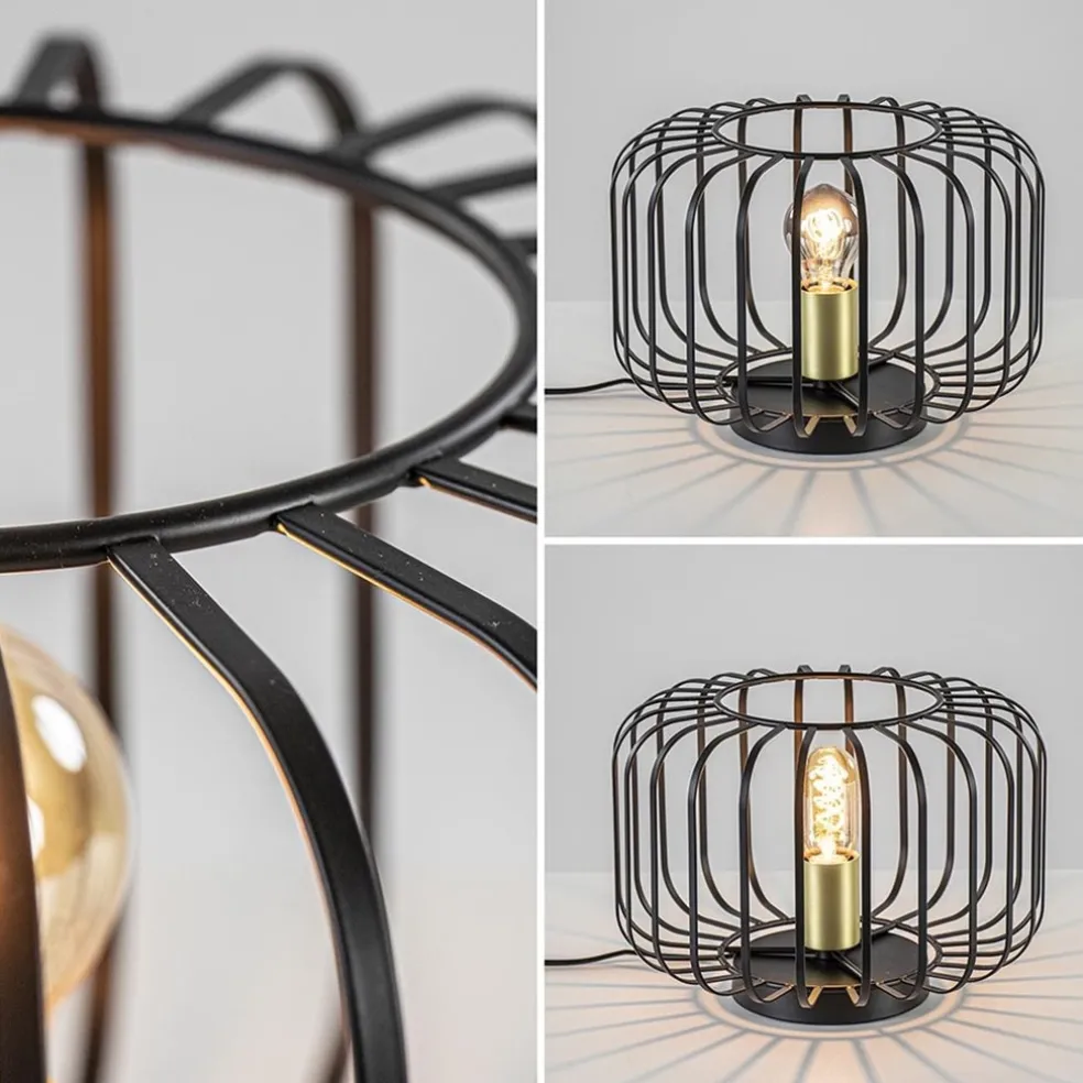 Een moderne tafellamp met een bronzen accent. De draad tafellamp is volledig van metaal en afgewerkt in een mat zwarte finish. Alleen de fitting is voorzien van een bronzen kleur. De kleuren combinatie maakt de tafellamp prima geschikt voor diverse woonstijlen. De metalen draadkap wordt ondersteund door een ronde voet die is voorzien van een zwart snoer van 170 cm, met een schakelaar op 35 cm van de lamp. De moderne tafellamp wordt geleverd zonder lichtbron (E27).