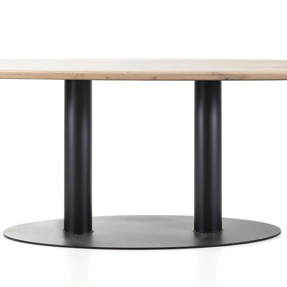Een prachtige ovale eettafel met een eiken houten blad. Het blad is uitgevoerd in de kleur naturel en is gelakt als afwerking. Het eiken blad heeft een afmeting van 300×120 cm en wordt ondersteund door een stevige metalen poot met een zwarte coating. De ovale eettafel staat prachtig in een hotel chic of robuust interieur en biedt genoeg ruimte van 6 tot 8 stoelen.