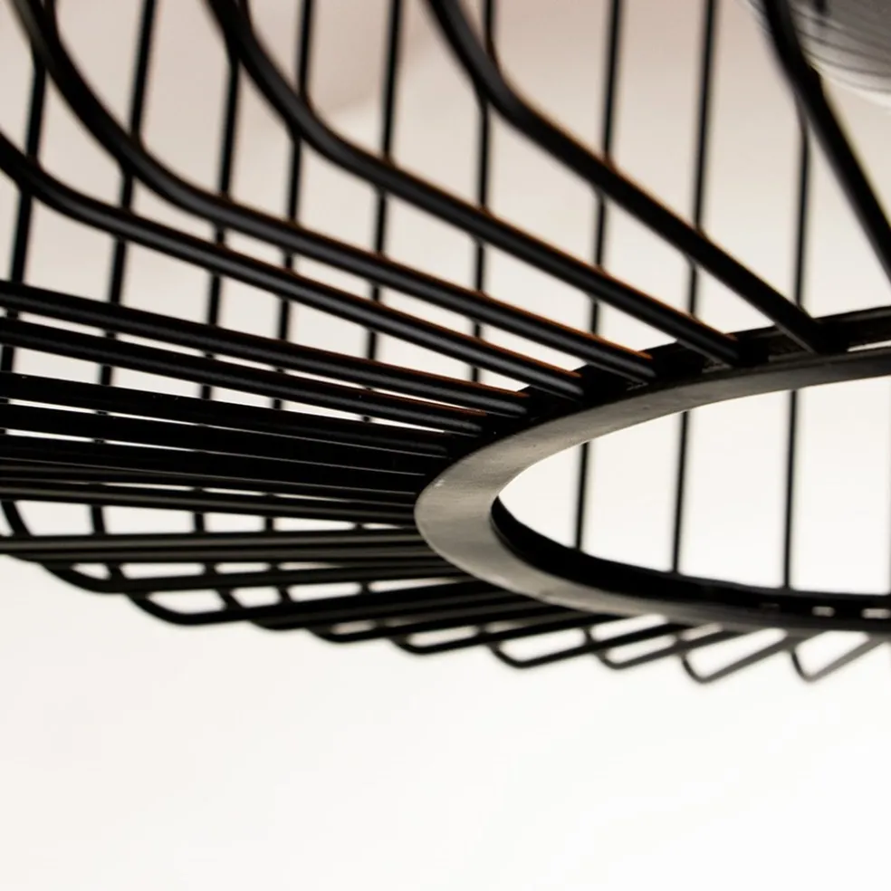 Een perfecte plafondlamp, prima geschikt voor diverse ruimtes en woonstijlen. Deze draad plafondlamp is gemaakt van metaal en uitgevoerd in het mat zwart. De ronde korf bestaat uit smalle speilen die bij de fitting samen komen. De draadplafondlamp is voorzien van een robuuste bevestiging die de lamp een stoere look geeft. De plafondlamp wordt geleverd zonder lichtbron en is dimbaar middels een externe dimmer (exclusief). Erg leuk in een hal, slaapkamer of toilet.
