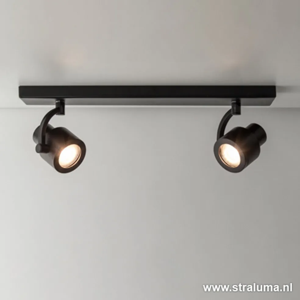 Moderne plafondspot uitgevoerd in staal en achteraf gespoten in mat zwart. Deze plafonnière komt uit de serie ‘Alto’, een mooie strakke serie opbouwspots in diverse uitvoeringen. De moderne spots zijn draaibaar en kantelbaar. Ideaal voor het uitlichten van een donkere hoek of lijst aan de muur. Door de zwarte uitvoering is deze 2-lichts spot uitstekend voor een modern of scandinavisch interieur.