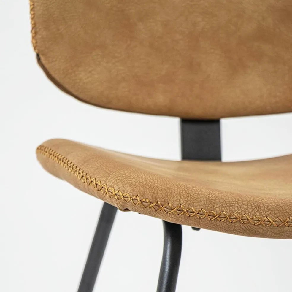 Met deze trendy eetkamerstoel maakt u uw eetkamer of eethoek helemaal af. De moderne stoel heeft een minimalistische look en feel die mooi is gecombineerd met retro details. Dit zorgt ervoor dat de stoel doet denken aan de jaren 50. De stevige stoel bestaat uit een metalen onderstel met smalle pootjes en een metalen steun in de rugleuning. Het metaal is afgewerkt met een mat zwarte poedercoating. De zitting en de rugleuning zijn gemaakt van imitatieleer met een zachte vintage uitstraling en uitgevoerd in het camel. Leuk detail is de kruis stik waarmee het imitatieleer is afgewerkt, dit geeft de eettkamerstoel net even meer karakter.