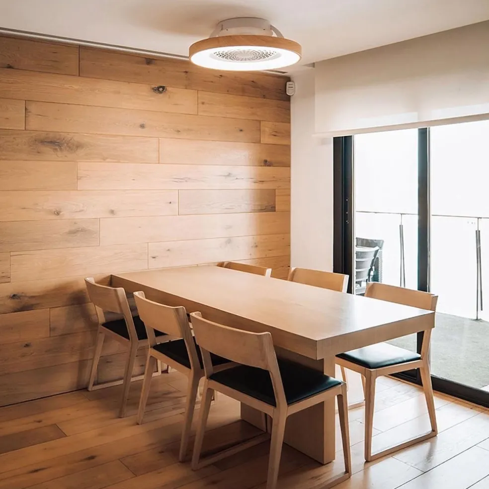 Een moderne plafondventilator met een strak design. Deze ronde ventilator bestaat uit twee delen, de buitenste houten ring is voorzien van geïntegreerd LED en de binnenste witte ring behuisd de ventilator. Het mooie is ook dat de ventilator en de lamp zijn te bedienen via de meegeleverde afstandsbediening, maar ook gemakkelijk met uw smartphone. Middels een app en bluetooth linkt u de ventilator gemakkelijk met uw smartphone en stelt u snel de gewenste snelheid van de ventilator in of dimt u de verlichting. De LED verlichting is in te stellen qua kleur en intensiteit, ideaal voor in de woonkamer of slaapkamer. De wit met houten plafondventilator met lamp heeft een zomer en een winter stand zodat u deze het hele jaar door kunt gebruiken.