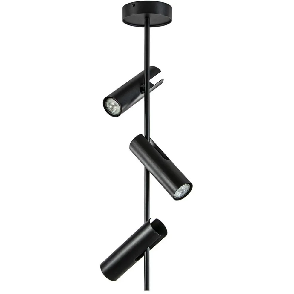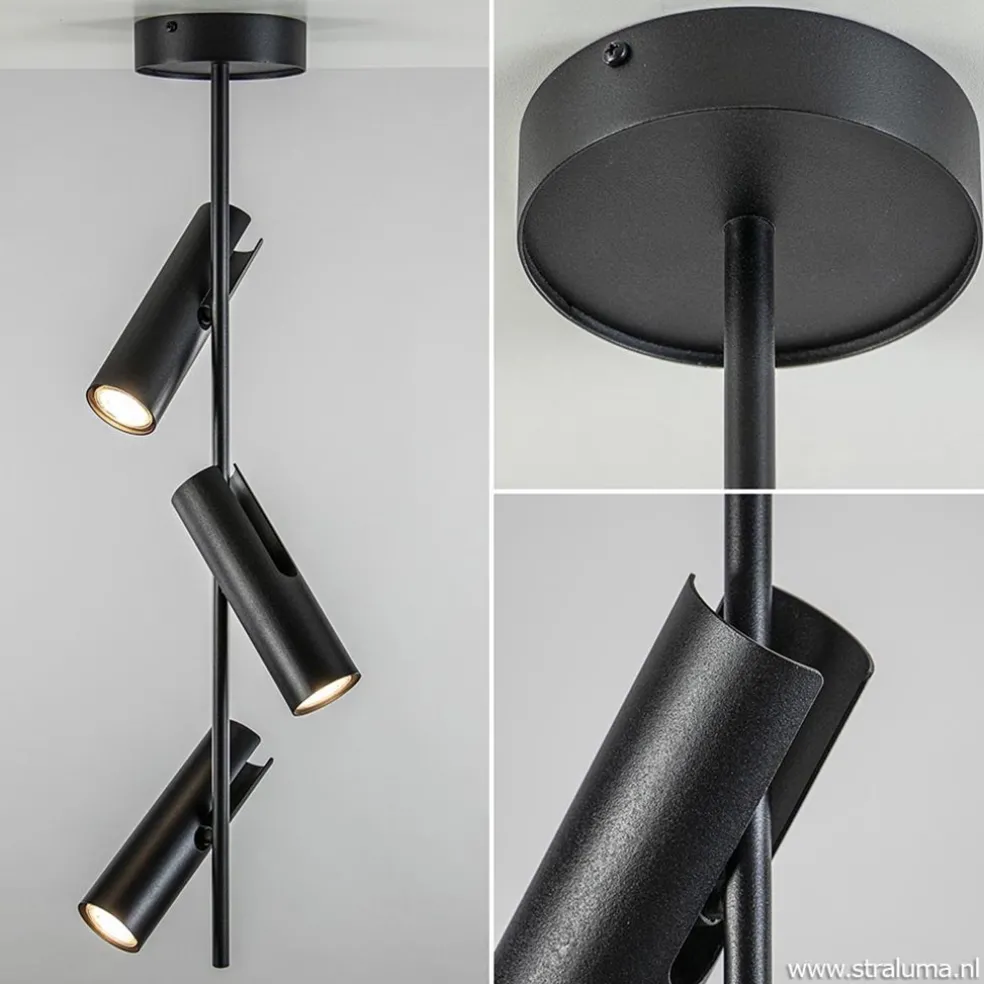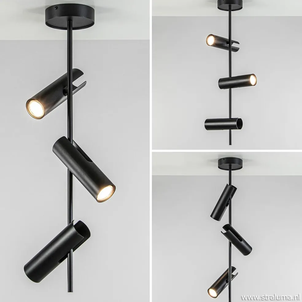 Een moderne plafondspot met een uniek design. De plafondlamp is volledig van metaal en uitgevoerd in mat zwart. Het unieke design maakt dat de spots op verschillende manieren zijn te verstellen. Zo zijn deze te kantelen en te draaien waarbij de opbouwspot op iedere manier een andere vorm krijgt. De drie spots zijn los van elkaar te verstellen, ideaal wanneer u iets wilt uitlichten of de lamp als extra sfeerlicht wilt plaatsen. De moderne plafondlamp heeft een hoogte van 75 cm, dit maakt de opbouwspot prima geschikt voor een ruimte met een hoog plafond. Let er dus goed op dat de lamp niet te laag wordt aan uw plafond. Een optie is de lamp bijvoorbeeld te plaatsen in de slaapkamer boven het bed, zodat u niet onder de lamp door hoeft te lopen. De zwarte plafondlamp wordt geleverd zonder lichtbronnen (3x GU10).