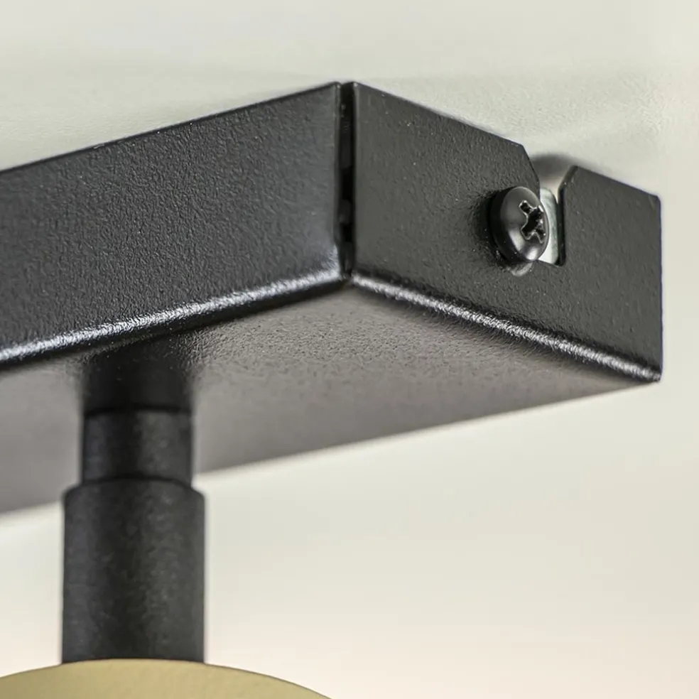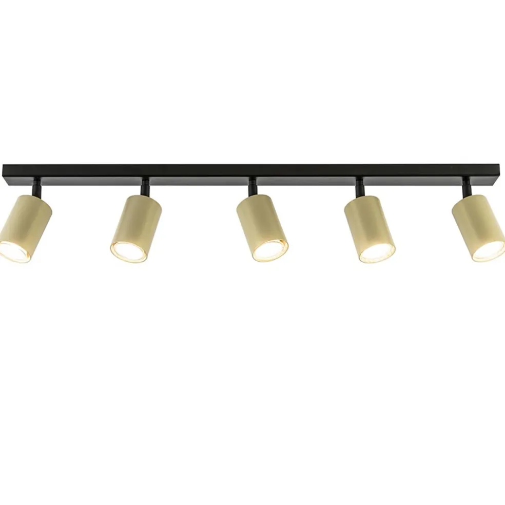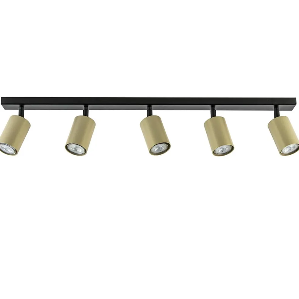 Heeft u een lange hal of kamer? Dan is dit de ideale lamp om de ruimte goed uit te lichten. Deze 5-lichts opbouwspot heeft een strakke moderne afwerking en past gemakkelijk in diverse woonstijlen. De langwerpige plafondspot is gemaakt van metaal en uitgevoerd in het goud met mat zwart. De cilinder vormige spots zijn naar wens te verstellen door deze te draaien en/of te kantelen. Zo kunt u ze gemakkelijk verstellen en zo de ruimte op de beste wijze uitlichten. De 5 gouden spots zijn bevestigd op een smalle balk van 80 cm die in het mat zwart is afgewerkt. De moderne opbouwspot wordt geleverd zonder lichtbron (5x GU10) en is dimbaar middels een externe dimmer (exclusief).