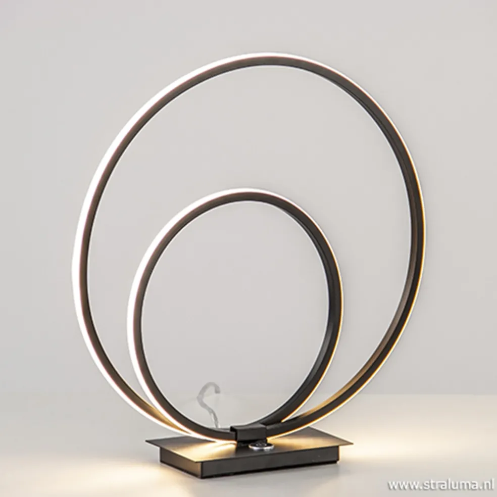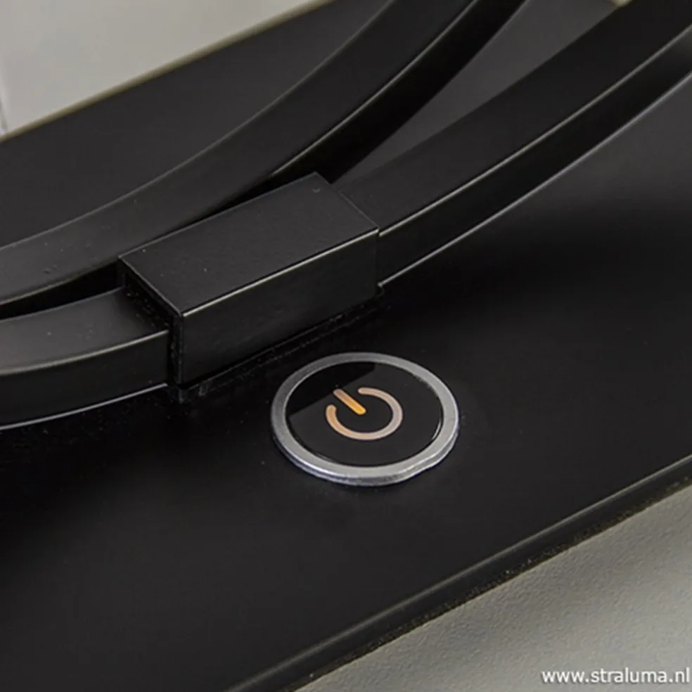 Een moderne LED tafellamp met touchdimmer. De mat zwarte tafellamp is op de voet voorzien van een touchknop die drie dimstanden kent. De bogen van de lamp zijn volledig voorzien van LED strips wat een mooie sfeervolle verlichting geeft en ook nog eens energiezuinig is. Een ideale sfeermaker met modern design!